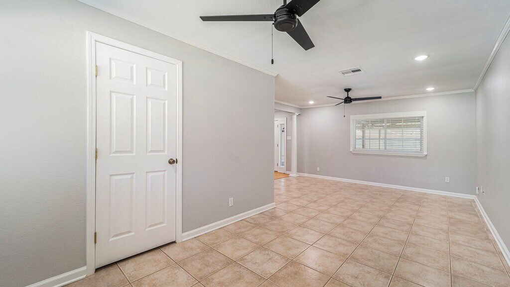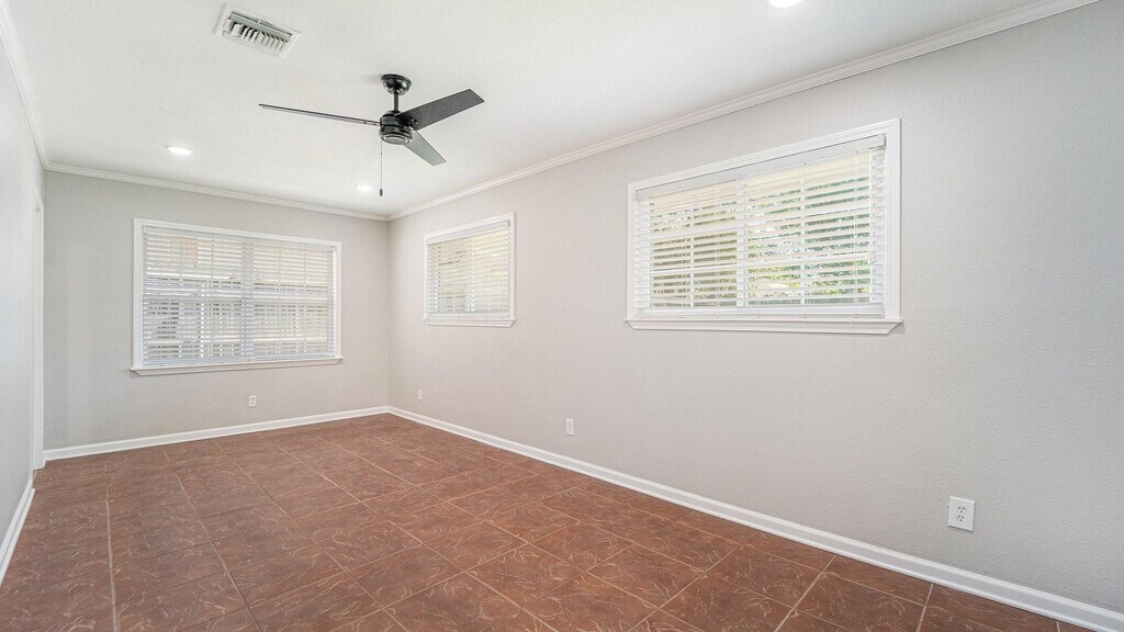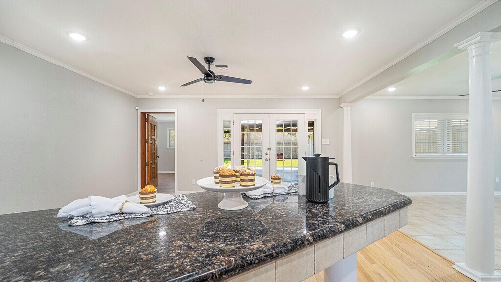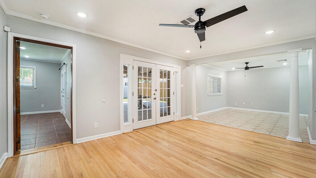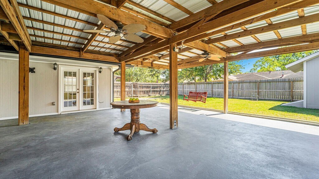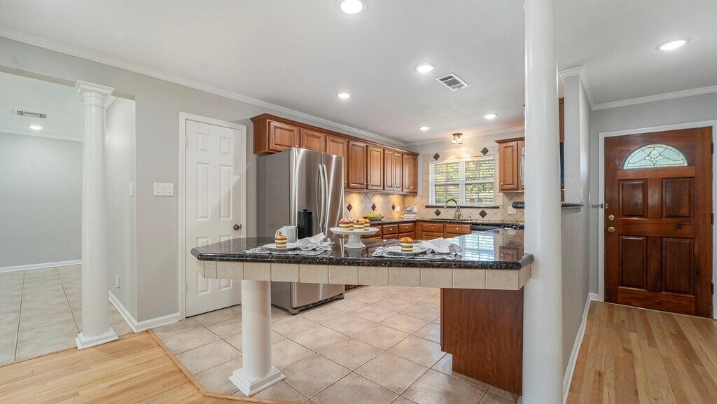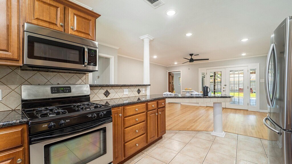 Did Not Flood! Beautifully updated home w/granite counter top in kitchen & tile backsplash,updated kitchen cabinets,tile flooring in den,crown molding,wood blinds,wood floors in secondary bedrooms,gas range,Tile floors in master bedroom,French doors off master and den to covered 21x22 patio. Close to medical center,great restaurants and shopping. Refrigerator,washer and dryer included! MLS# 12671752