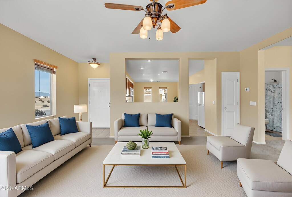Welcome to this inviting three-bedroom,single-level home,perfectly situated on a quiet corner lot in one of north Maricopa's most desirable neighborhoods. Located directly across from a large greenbelt park,the home is filled with natural light and offers a peaceful,welcoming atmosphere that's ideal for family gatherings,entertaining friends,or enjoying relaxing evenings outdoors. The well designed layout creates an easy flow throughout the home,while the spacious corner lot provides enhanced privacy and an open,airy feel that's hard to find. Enjoy the convenience of being close to shopping,dining,schools,and Maricopa's closest freeway access,making daily errands and commuting a breeze. This home truly offers the perfect blend of comfort,location,and lifestyle.