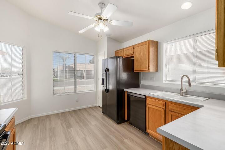 This charming 3-bed,2-bath residence in Chandler welcomes you with a blend of sophistication and comfort! Featuring a large front yard and a 2-car garage. Desirable interior showcases a spacious living/dining room,upgraded flooring,ceiling fans,elegant archways,and vaulted ceilings enhanced by abundant natural light. The kitchen is a cook's delight with built-in appliances,rich wood cabinetry,ample counter space,a convenient pantry,and a cozy breakfast nook. Retreat to the main bedroom,highlighting a serene sitting area,a full bathroom w/dual sinks,and a walk-in closet. The generous backyard is a low-maintenance haven providing a useful storage shed,pavers,lots of space for gatherings,& a covered patio,perfect for relaxation or entertaining. Don't let this one get away!