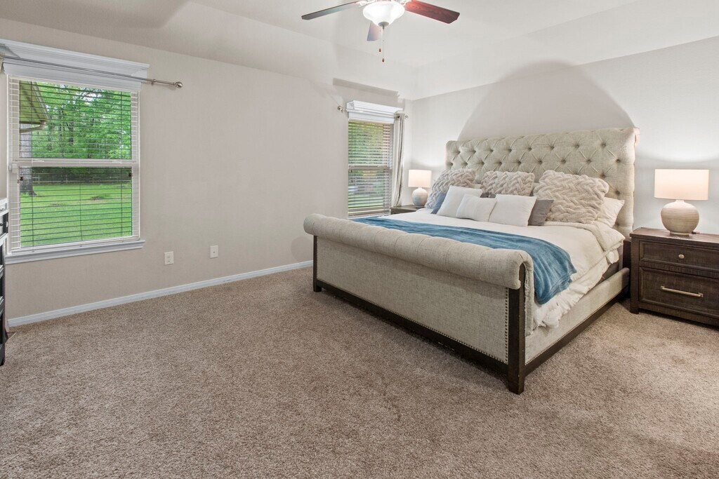 STUNNING 4-bedroom,2-bath,single-story home on just over an acre in the sought-after Deer Trail Two community,offering a spacious country feel with convenient access to I-45 and 59. Inside,you'll find an inviting open-concept layout featuring elegant wood flooring,granite countertops,stainless steel appliances,and bar seating. The bright and airy master suite offers ample space for a cozy seating area,while the attached ensuite boasts double sinks,a soaking tub,a walk-in shower,and an expansive walk-in closet. The three additional bedrooms include ceiling fans and plush,like-new carpeting. Step outside to a GORGEOUS covered stamped concrete patio with a tongue-and-groove ceiling and recessed lighting—perfect for relaxing or entertaining. The fully fenced backyard includes a storage shed for extra convenience. Enjoy a low tax rate,low HOA fees,and no MUD tax! MLS# 74433318