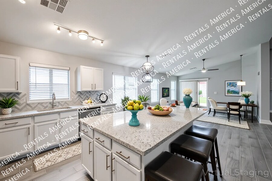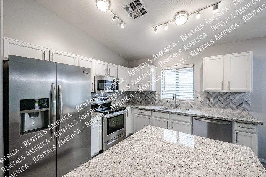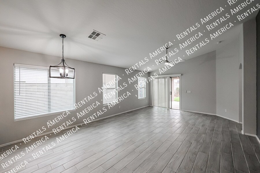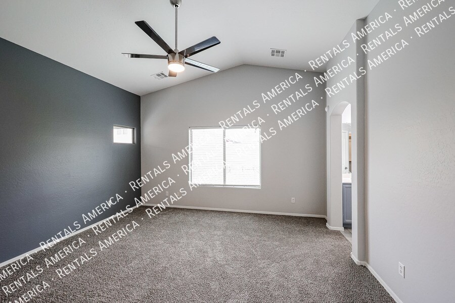 MI Special: Remainder of FEB RENT FREE + $875 OFF MARCH RENT with approval and move-in within 7 days; Monthly Landscape Included! Beautiful 4BD 2BA highly located in the desirable Maricopa Meadows! Ceiling fans throughout, vaulted ceilings, tons of natural light, and wood-look tile flooring w/carpet in bedrooms. Open floorplan with master bedroom off the family room area. The kitchen offers SS appliances, granite counters, a walk-in pantry, tile backsplash, track lighting and an island w/breakfast bar. Master bathroom has dual sinks, separate tub/shower, & a walk-in closet. All bedrooms are good in size. Enjoy the perfectly sized backyard with a lush lawn & a cozy covered patio! A MUST SEE! One Time Admin Fee: $300, Pet Deposit: $300/pet (If applicable), Service Fee: 2%. Resident Benefits Package: $39/month. Helping Heroes Discount Available! Carpet Cats Allowed Ceramic Tile Disposal Dogs Allowed Dryer Garage Pets Allowed Washer
