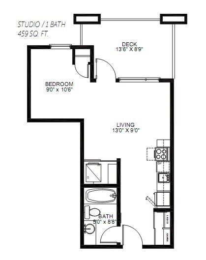 Modern Studio Apartment — Spacious Layout + Private Deck (459 sq. ft.) Welcome to our bright and efficiently designed studio apartment. This thoughtfully planned 459 sq. ft. home offers the perfect blend of comfort and convenience, featuring a semi-separated sleeping area and an open-concept living space. The large 13'6" x 8'9" private deck extends your living area and is ideal for relaxing outdoors. Inside, the suite includes a full kitchen with modern appliances, a comfortable living area, and a well-appointed 3-piece bathroom. Suite Highlights: 459 sq. ft. studio with smart, functional layout Private deck for outdoor enjoyment Bright living space with open-concept design Semi-enclosed bedroom nook for added privacy Full kitchen with modern appliances 3-piece bathroom with full-size tub/shower Perfect for students, working professionals, or anyone seeking a clean, modern space in a walkable neighborhood. Disclaimer: Floor plans and photos shown may not be of the exact unit. Finishes, layout variations, and views may differ slightly depending on floor level and unit location. Bright and modern, this studio apartment is in prime location! Garrison Crossing is a beautiful community, close to shops, eateries, the university and more! Features include: - Stainless appliances - In-suite laundry - Storage locker - Underground parking - Professionally owned and managed - No smoking, no pets