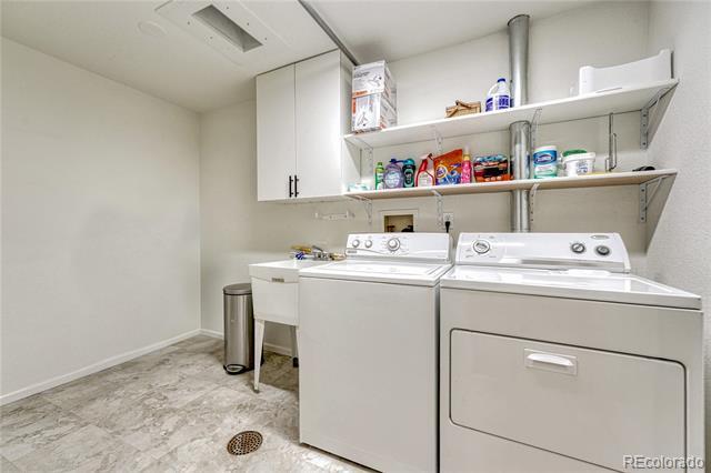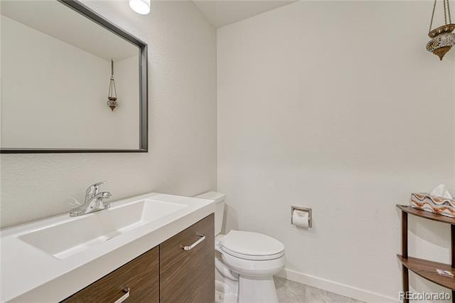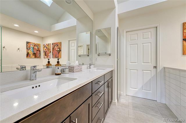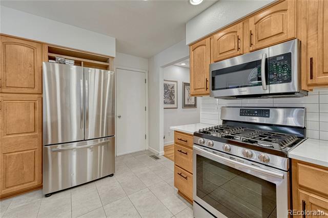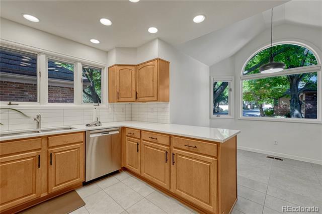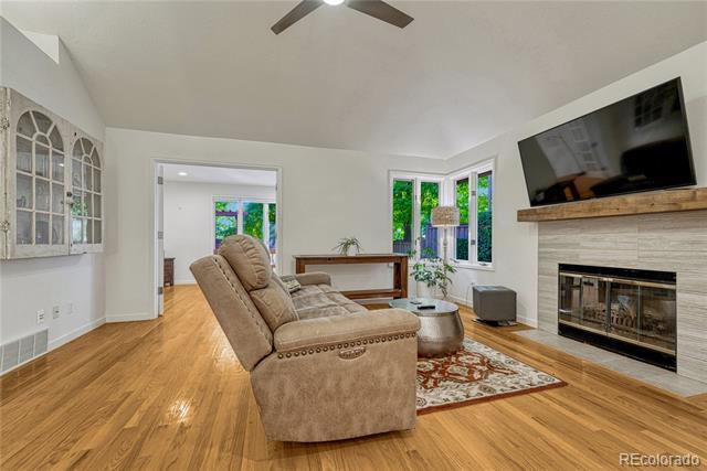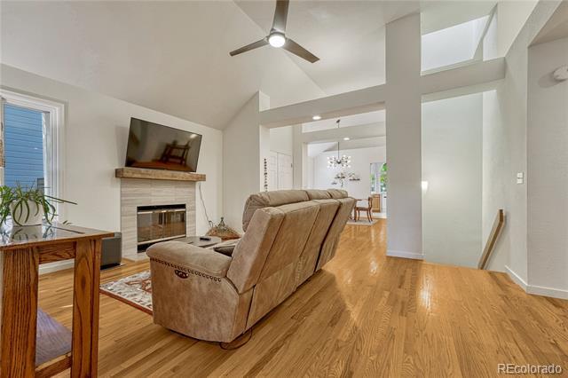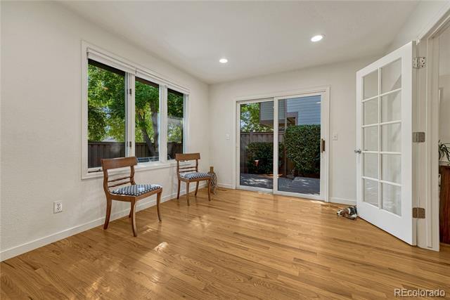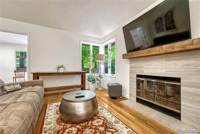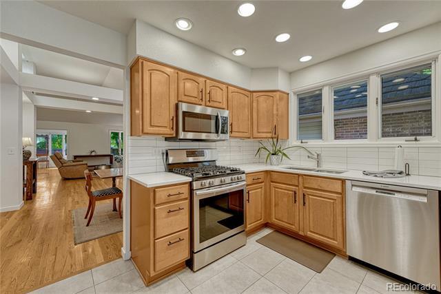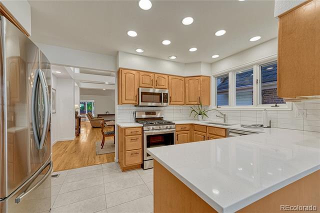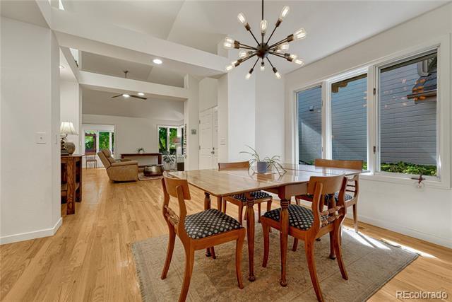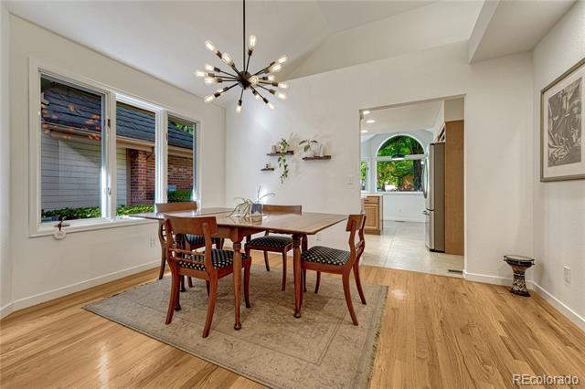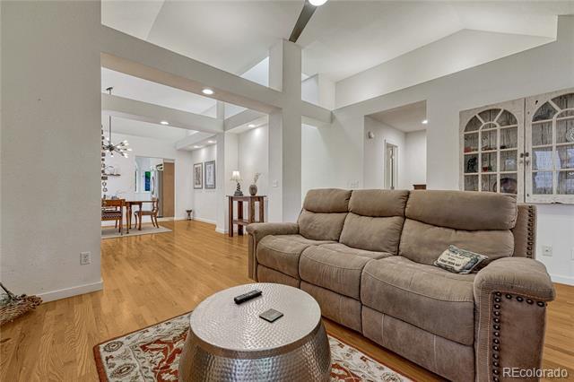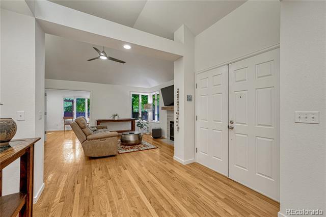 Welcome to this immaculate ranch-style home in the private Central Park community of Denver. Nestled on a quiet, tree-lined street, this residence offers 3 bedrooms, 3 bathrooms, and over 2,300 finished square feet of beautifully maintained living space. Step inside to soaring vaulted ceilings and gleaming hardwood floors that flow through the main living areas. The spacious living room features a cozy gas fireplace and large windows that fill the home with natural light. A bright dining room with modern lighting opens seamlessly to the remodeled eat-in kitchen, complete with quartz countertops, stainless steel appliances, a breakfast nook, and plentiful cabinetry. The main-floor primary suite boasts direct access to the backyard sanctuary, a walk-in closet, and a luxurious 5-piece bath. A sunny office with French doors and backyard access offers flexible space for work or an additional bedroom. The finished basement expands the living area with two generous bedrooms, a full bath, laundry room with utility sink, and a versatile family/game room option. Outdoor living is exceptional with a large private deck surrounded by low-maintenance landscaping, evergreens, and perennials with drip irrigation. The home also offers ample storage with a lighted crawl space, attic access, and an attached 2-car garage. Updates include a stone-coated metal roof, newer furnace, water heater, and central A/C. Enjoy the convenience of being close to I-25, light rail, shopping, dining, parks, and trails while savoring the privacy of this 33-home enclave with beautifully maintained common areas. Single Family Residence MLS# 1557068