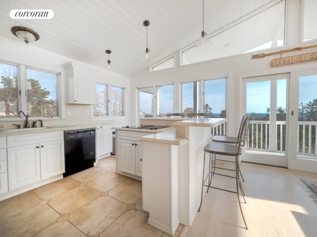Enjoy the vast ocean views from this 3 story contemporary overlooking Montauk village. The spacious open floor plan on the top floor boasts wraparound windows to enjoy the daily sunrises and sunsets from your hilltop perch. Gourmet kitchen, cozy living room opens on to the sunny outdoor deck space for outdoor dining. Home consists of 4 bedrooms, 3.5 baths and sliders to brick patio and saltwater pool complete with outdoor shower. [[Rental Registration # 24-306]]