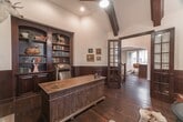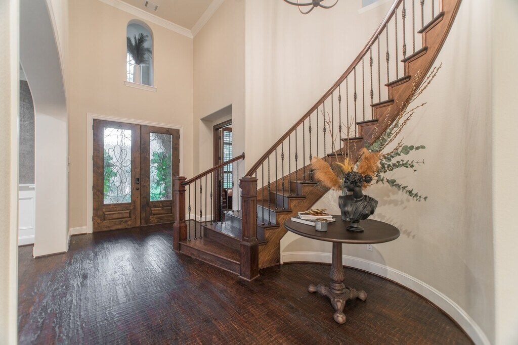 Soaring ceilings! Double door entry! Spiral Wrought iron & wood staircase in entry! 5 bedrooms w/ 2 beds down! Real 3 car garage! 1/2 bath up for Game room (with walk in wet bar and mini frig) & True Media room w/ surround sound! 1/2 bath down for guests! Backyard Oasis w/ Pool,spa,outdoor kitchen and large covered back porch PLUS own Pool Bath! Return staircase! Hand scraped wood floors and Tile floors throughout downstairs area + Master and Game room have hand scraped wood floors as well! Large island kitchen w/ SS appliances including double ovens,built in refrigerator + Scots Ice Machine! Butlers pantry w/ beverage cooler! Kitchen overlooks family room w/ Vaulted Wood beams on ceiling + stone gas log fireplace! Wood shutters are stunning! Study with French doors,hand scraped wood plus wood beams on Vaulted ceiling! Large laundry room w/ Sink + MUD area off garage w/ built ins! Epoxy Floors in Garage! MLS# 88332189