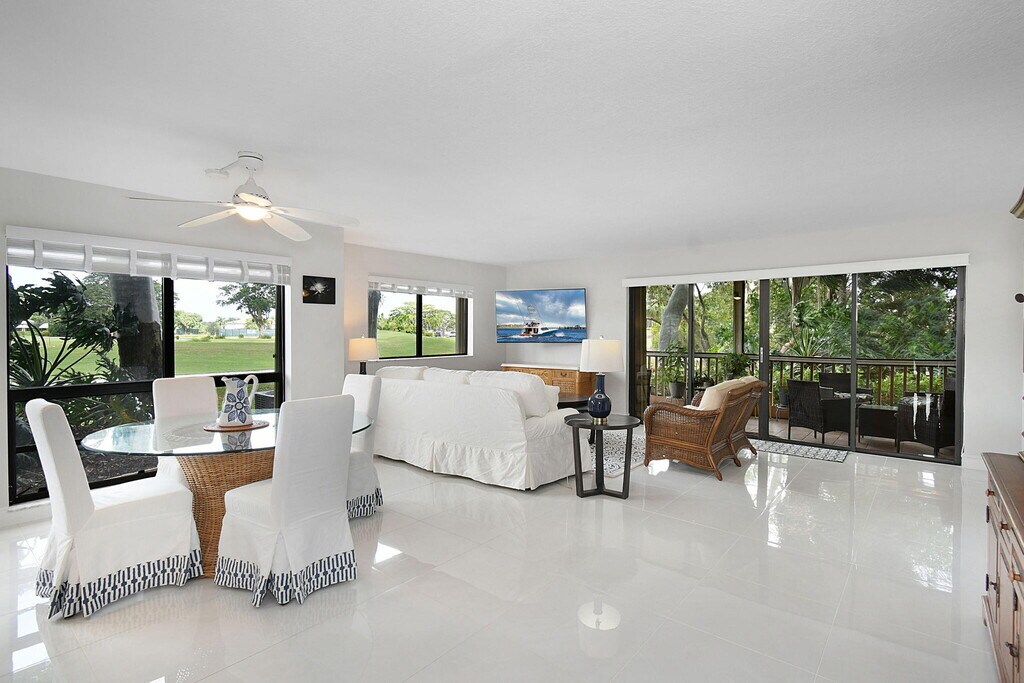 Fully furnished ground floor Golf Villa overlooks the 9th green of Staples short course and filtered views of the Champion driving range. Ideal golf views & shaded patio from the adjacent trees. Updated interior with a beautiful scenic view throughout the living area and great natural light. The master bedroom includes a king-sized bed (with large flat screen TV) and two queen beds in the guest bedroom and a large flat screen TV in the living room. The serene screened outdoor patio is ideal for entertaining or just relaxing with a book. The condo has full sized in-unit washer & dryer. The seasonal rent includes Wi-Fi & basic cable TV, water & sewer and electricity (up to $125/month). One of the 2 community pools is located within 100 yards.