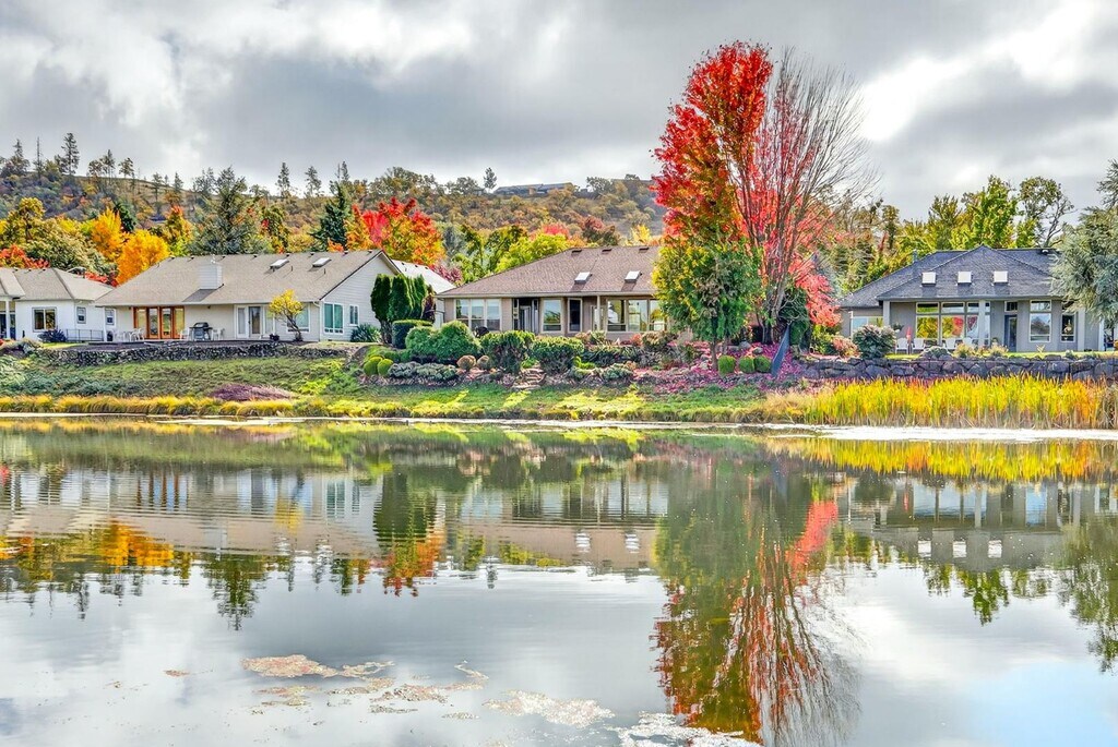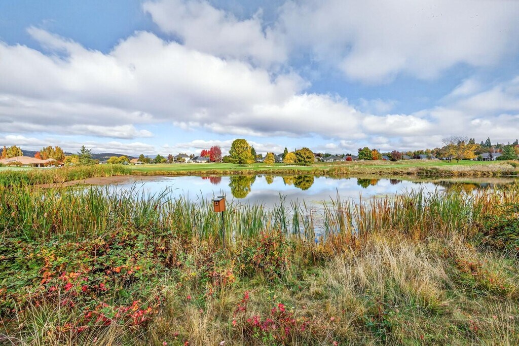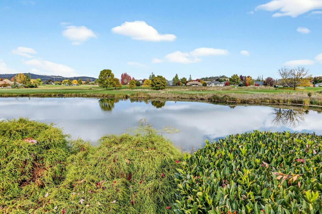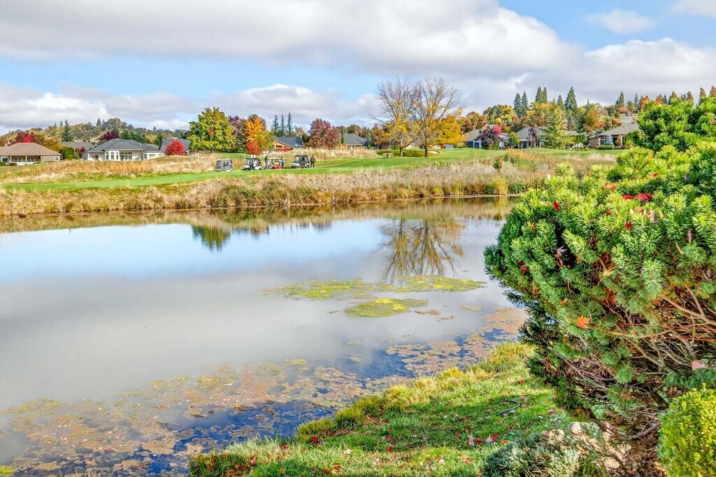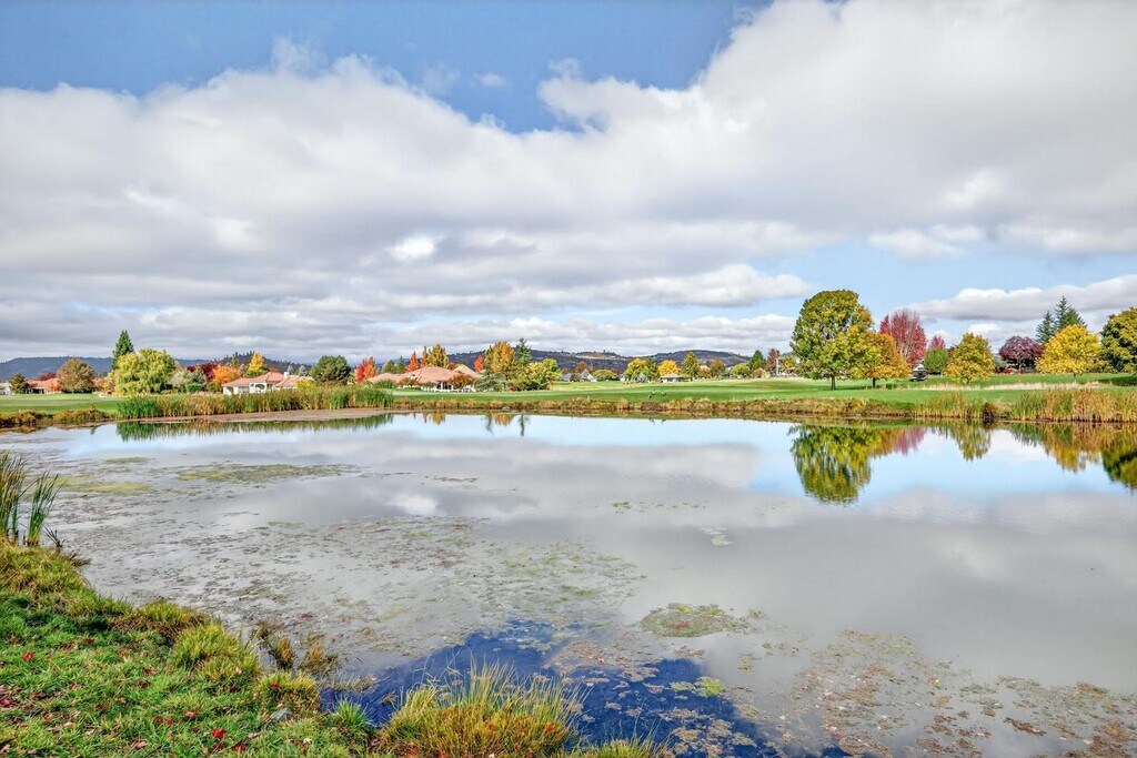 **Kitchen floor is being refinished, and new flooring is going in the master bathroom.** Experience luxury living at the pond’s edge on the 6th fairway of the Robert Trent Jones Jr. designed Eagle Point Golf Course. You’ll enjoy breathtaking views of the water, golf course, and Table Rocks from main living areas. The open floor plan boasts high ceilings and arched doorways that lead to an office w/ a built-in desk and the formal dining area, there is elegant crown molding throughout, built-in art niches, and a dramatic floor-to-ceiling river rock fireplace. The gourmet kitchen w/ island includes granite counters, abundant storage, and stainless appliances. The home has a split floor plan with guest bedrooms off the kitchen and the master suite off the living room. The master features a spacious ensuite with jetted tub, large walk-in closet, and stunning views. The backyard offers a covered patio plumbed for gas with skylights, pond frontage, and beautiful grounds. Landscaping in...