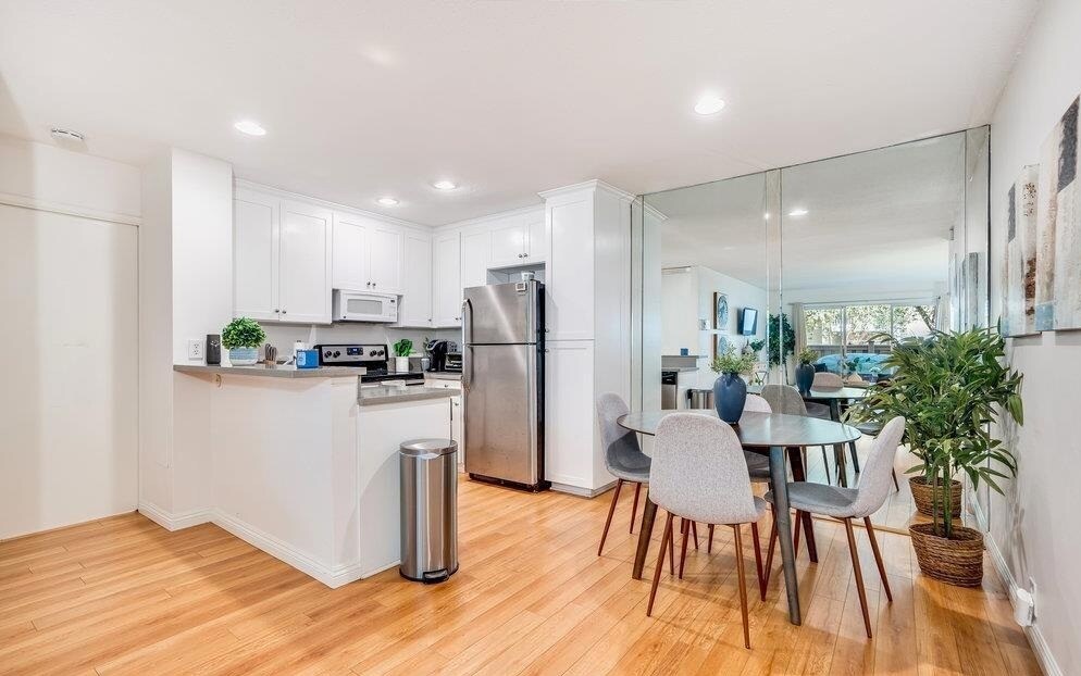 Ideally situated one bedroom, one bath condo offers 680sq. ft. of usable space is fully equipped with Quartz counters, stainless steel appliances, Shaker-style cabinetry, engineered Birchwood floors throughout, an expansive private patio, and one assigned parking space! The Plaza continues to be a much desired residential building with an array of Resort-lifestyle amenities such as multiple pools, tennis courts, sauna, hot tub, billiards room, Zen-like lagoon, outdoor deck with gathering areas, BBQ's & Fitness center. Centrally located within close proximity to all of life's conveniences from a short walk to the shopping center or a bike ride to the Beach!