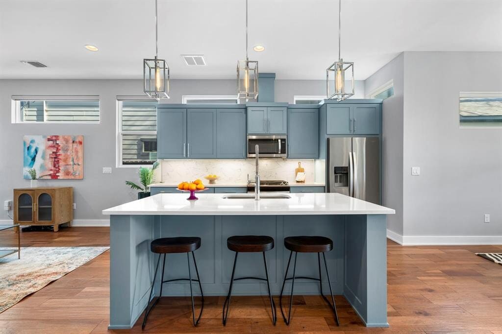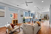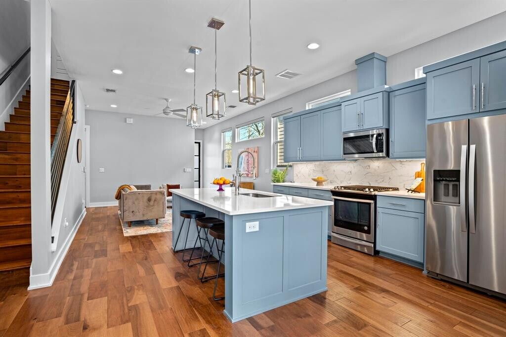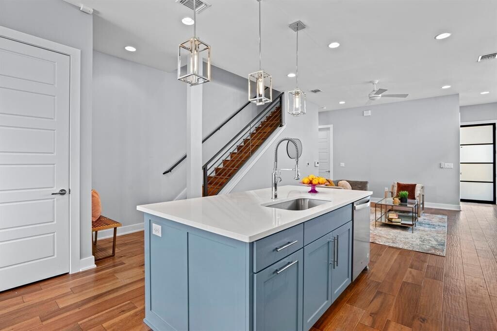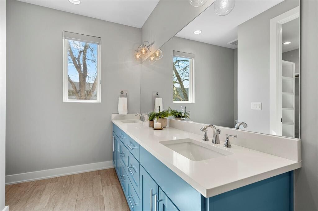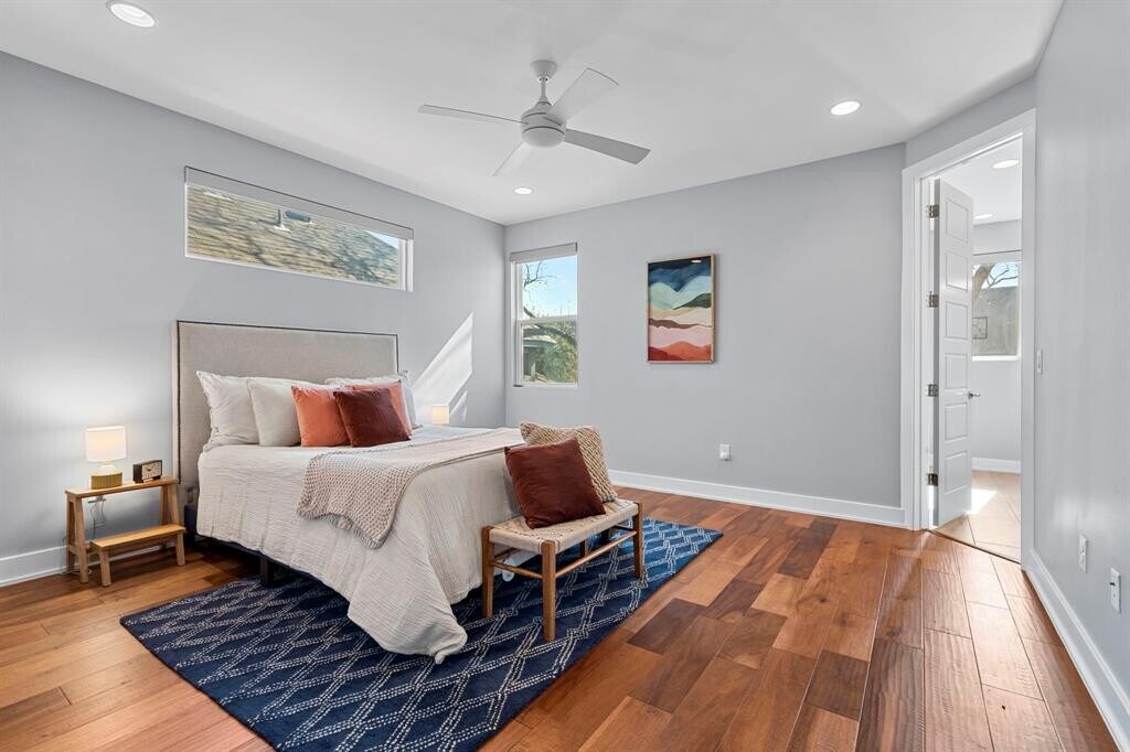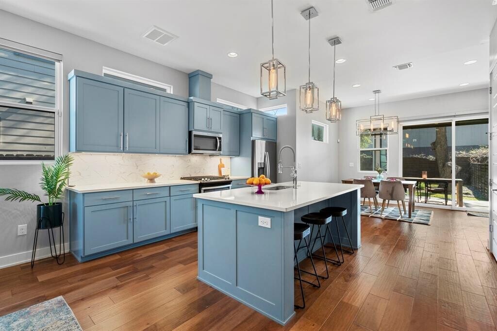 Exceptional East Austin 3 Bed/2/5 Bath Modern Farmhouse Style Corner Unit! Available mid-December. Gorgeous wood floors, quartz countertops and designer touches throughout. Ample storage, including quiet-close cabinetry. Stainless steel appliances, separate pantry, and generous island highlight the open kitchen. Ideal for entertaining and quiet evenings in; the wall of windows opens the living area to the covered patio and private, pet-friendly, shaded, fenced yard. Living, dining, kitchen, half-bath, utility room and two-car garage with storage galore, downstairs. Three bedrooms and two full baths upstairs. Spacious primary suite boasts bountiful built-in shelving in wonderful walk-in closet, dual vanity and separate shower. Abundant natural light, remote controlled window shades, and security system with monitoring option. Easy access to East Austin shopping, dining, Southern Walnut Creek Trail, East Boggy Creek Greenbelt and major Austin thoroughfares. Walking distance to Medici Roasting, Small’s Pizza, The Front Page, Mam Mam, Zhi Tea, Sky Candy and Springdale General.