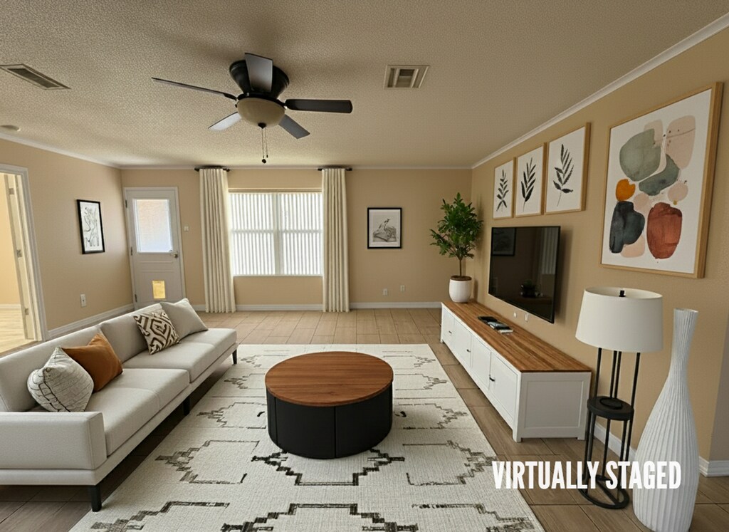 View 360 Virtual Tour: Step into this stunning 4-bedroom, 2-bath home showcasing beautiful patterned ceramic tile designs throughout. The modern kitchen features stainless steel appliances, perfect for both everyday cooking and entertaining. Enjoy plenty of parking with an attached 2-car garage and a bonus driveway ideal for an RV or additional vehicles. The backyard is built for relaxation and gatherings with a covered patio, paved walkway, and a charming gazebo. This home perfectly blends comfort, functionality, and outdoor appeal. Disclaimer: The furnishings or enhancements shown are AI-generated and intended for inspiration only. They may not reflect the actual scale, condition, or current features of the property.