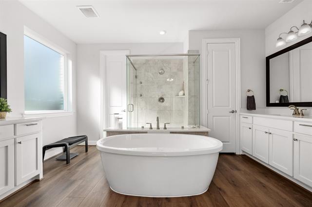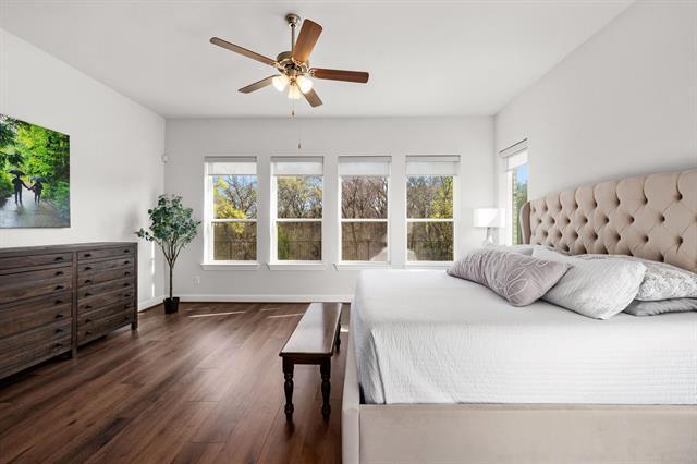 Experience the distinguished Rockwall lifestyle in the sought-after Breezy Hill community, which offers a range of amenities to include miles of tree lined trails and greenbelts, community pool with lounge area, playgrounds, tot lots, parks, ponds, pavilion, and multi-purpose ballpark. This location is conveniently situated just minutes from Lake Ray Hubbard and Downtown Rockwall. This exceptional residence is situated on an interior lot that backs to a spacious greenbelt with abundant trees and a nearby walking trail. Impressive drive-up appeal with professional landscaping and 3 car garage with cabinets, slatwall to hang tools, and coated floors. Grand foyer with soaring ceilings, a spiral staircase with black wrought iron railing, and access to the study with custom sliding black frame and glass door. Leading to the 2-car garage area is a secondary bedroom with full bathroom directly across the hall. The formal dining and breakfast nook are conveniently located near the delicious gourmet kitchen with stainless-steel appliances, refrigerator, and oversized island open to the stunning family room with fireplace, soaring ceilings, and incredible views of the greenbelt. The primary bedroom is located downstairs with window views of the greenbelt. The ensuite bath has a garden tub, separate shower, double vanities with large walk-in closet. Near the primary is the laundry room with room for a full-sized washer and dryer. Upstairs enjoy the huge game room or children’s retreat with nook for desk. Down the hallway, you’ll find 2 bedrooms and a full bathroom. Outback, enjoy the huge yard with the privacy the greenbelt provides. Additional features include recessed lighting and custom lighting, most with dimmers, as well as permanent and programmable exterior gemstone lighting under the eaves of the front elevation. This desired listing won’t last long!