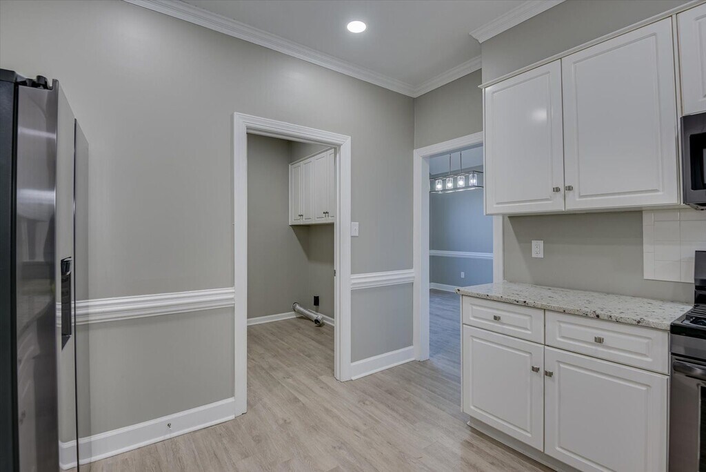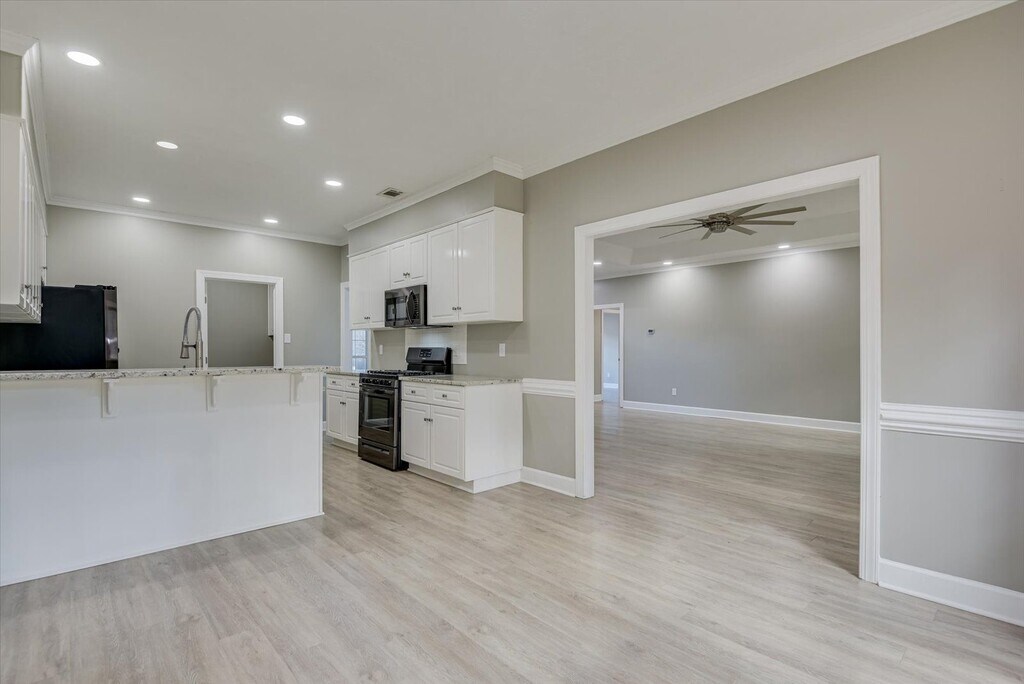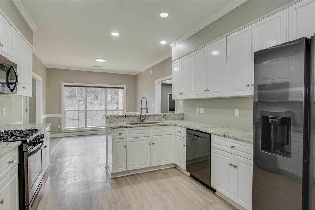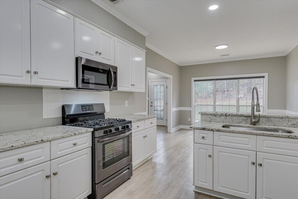 Renovated three-bedroom, two-bath home featuring granite countertops, LVP flooring throughout, new 2" blinds, an attached garage, and washer/dryer hookups. Located just off Washington Road with Kroger and a Walmart Supercenter nearby, plus local dining like Eggs Up Grill and Rally Point Grille within easy reach.