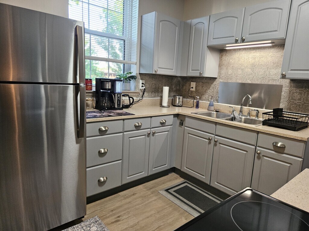The EAST unit is an UPSTAIRS, Fully Furnished 2 Bedroom, 1 Bath. The full kitchen features Stainless Steel appliances with a Refrigerator, Glass top Electric stove and Microwave above the stove. The Bedrooms have all linens with an extra set of sheets provided. The larger bedroom has a Full-size bed and the smaller bedroom has a Twin size bed. Both bedrooms have a closet. The larger bedroom has a small office space for your work needs. The Living room has a full size couch that reclines on both ends and Internet ROKU TV. The kitchen is stocked with all the dishes, pans and Utensils. There is a 2-slice Toaster, an Electric Tea Kettle and Ninja Coffee Pot to get you started in the morning. The bathroom is stocked with Towels and washcloths, and a Hairdryer is provided. Other items provided are Vacuum Cleaner, Cleaning supplies, Hampers and a Laundry room on site. There is a Pantry space in the unit.