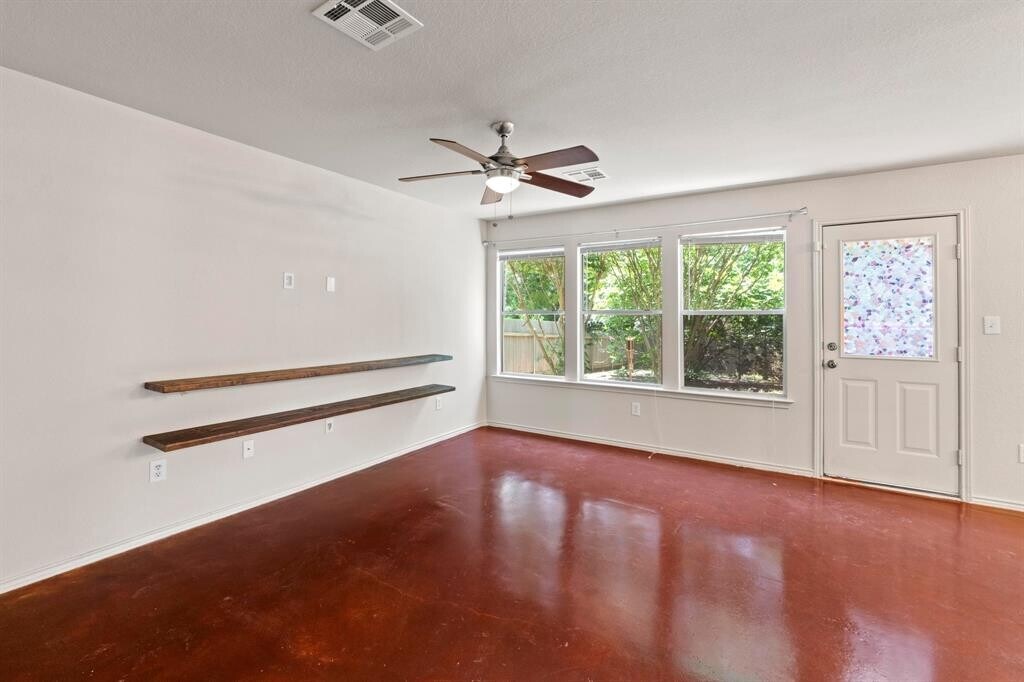 Carson HinerCharming 2-story home in Austin's 78725 zip code, offering a serene retreat surrounded by towering trees and the sweet scent of fresh figs. The backyard boasts a delightful fig tree, perfect for enjoying fresh fruit or relaxing in the shade. As you step inside, you'll notice the functional open layout on the main level, complete with high ceilings and stained concrete flooring throughout. The bright and airy living room invites you to linger, with a ceiling fan and direct access to the patio and fully fenced backyard great for outdoor dining or simply soaking up the sunshine. The dining area flows seamlessly into the kitchen and living area, making it perfect for everyday meals and gatherings. The kitchen features a bar, laminate countertops, a pantry, fridge, and windows that let in plenty of natural light. A convenient flex space and half bath round out the main level. Upstairs, the three bedrooms await, including a serene primary bedroom with a high ceiling, elegant light fixture, and ceiling fan. The en-suite bathroom includes a long vanity, deep soaking tub, separate walk-in shower, and a walk-in closet. The two secondary bedrooms each feature a ceiling fan and walk-in closet, providing ample space for rest and relaxation. The laundry room is conveniently located upstairs, making it easy to tackle household chores. The neighborhood is a haven for outdoor enthusiasts, with a park, playground, pool, and trails waiting to be explored.