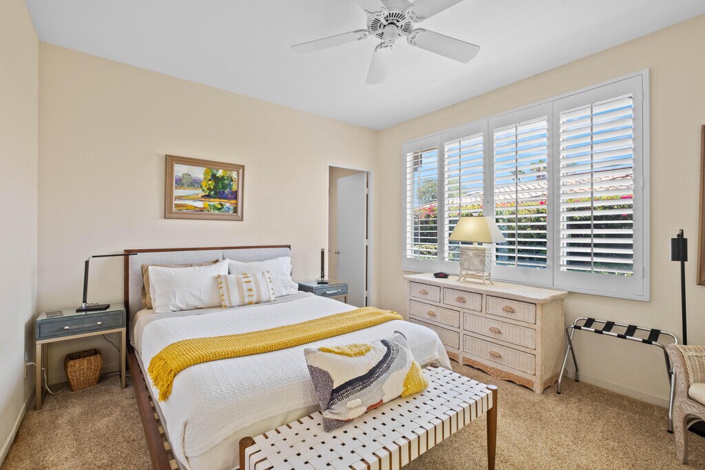 Available February-April 2026 in Indian Ridge Country Club,Palm Desert! Step into luxury desert living with this fully furnished,south-facing Acacia 4 home (3BR / 3.5BA). Designed for both relaxation and entertaining,this popular floor plan offers a light-filled living room with fireplace,elegant dining space,and a gourmet kitchen with breakfast area. From the patio,kitchen,and main living areas,enjoy sweeping panoramic views of the Santa Rosa Mountains and lush fairways,your backdrop for morning coffee or sunset cocktails. Inside,upgrades abound with shutters in the bedrooms and kitchen,custom faux-painted accent walls,and gleaming ceramic tile in the entry,hallway,kitchen,and dining room. One guest room doubles as a home office with built-in desk and queen sofa bed,while the primary suite spoils you with a king bed,spa-style bath,separate tub and shower,and an oversized walk-in closet. A second guest suite offers twin beds for flexibility. Set on a private interior street with the community pool and spa just steps away,this home makes seasonal living effortless. The owner covers HOA dues plus monthly caps on gas and electric. Club privileges may be available with a 3-month lease minimum (additional fee). This isn't just a rental! It's your desert retreat,wrapped in sunshine,mountain views,and resort-style amenities.