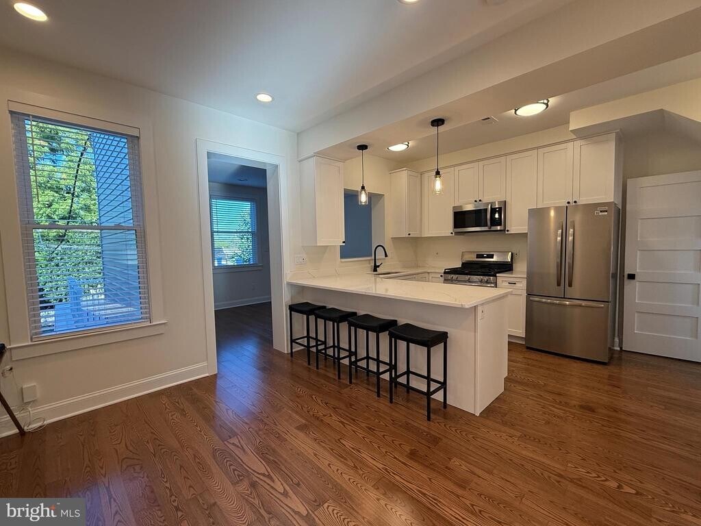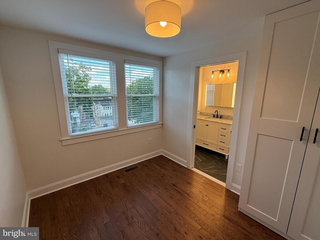 his spacious home boasts 4 bedrooms and 3 bathrooms on three fully finished levels. Be the first to live in this fully renovated and move-in ready home with an enclosed two-car garage. Over the past year, this charming home has undergone a major renovation, including a roof replacement, new plumbing and electrical wiring, central air and heat, hardwood flooring, new interior and exterior doors, new windows in rear, new trim and baseboard throughout, luxurious bathrooms and a gourmet kitchen. Pass through the refinished front porch and step inside to discover a welcoming open floor plan adorned with elegant hardwood floors that flow seamlessly throughout the three main living areas. The bright and airy kitchen includes new cabinets, expansive quartz countertops offering counter seating for four, and new stainless steel appliances. The opening above the kitchen sink looks into the sunny den at the rear of the main level, improved with new windows and an exterior door with direct access to the spacious composite deck above the two-car garage. Upstairs, the master bedroom is adjoined by an added room, providing flexibility for a home office, baby room, or private TV room. The master bathroom includes a pocket door, wide vanity, and a walk-in shower with its own skylight. The two additional upstairs bedrooms share a second full bath with a full-size bathtub and a second skylight. Head downstairs to the fully finished basement level offering extra living space, a newly added full bathroom with its own walk-in shower, a laundry room and ample storage space. A fourth bedroom also was added in the basement and includes a large window and glass exterior door, providing ample natural light and its own private entrance. The detached two car garage also has undergone an extensive renovation with a new roof and the addition of an electric garage door. The dwelling is approximately 2,250 square feet according to the architectural floor plans, the garage interior is approximately 270 square feet, and the rooftop deck and front porch add approximately 225 and 84 square feet of outdoor living space, respectively.