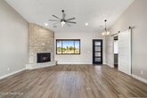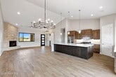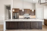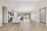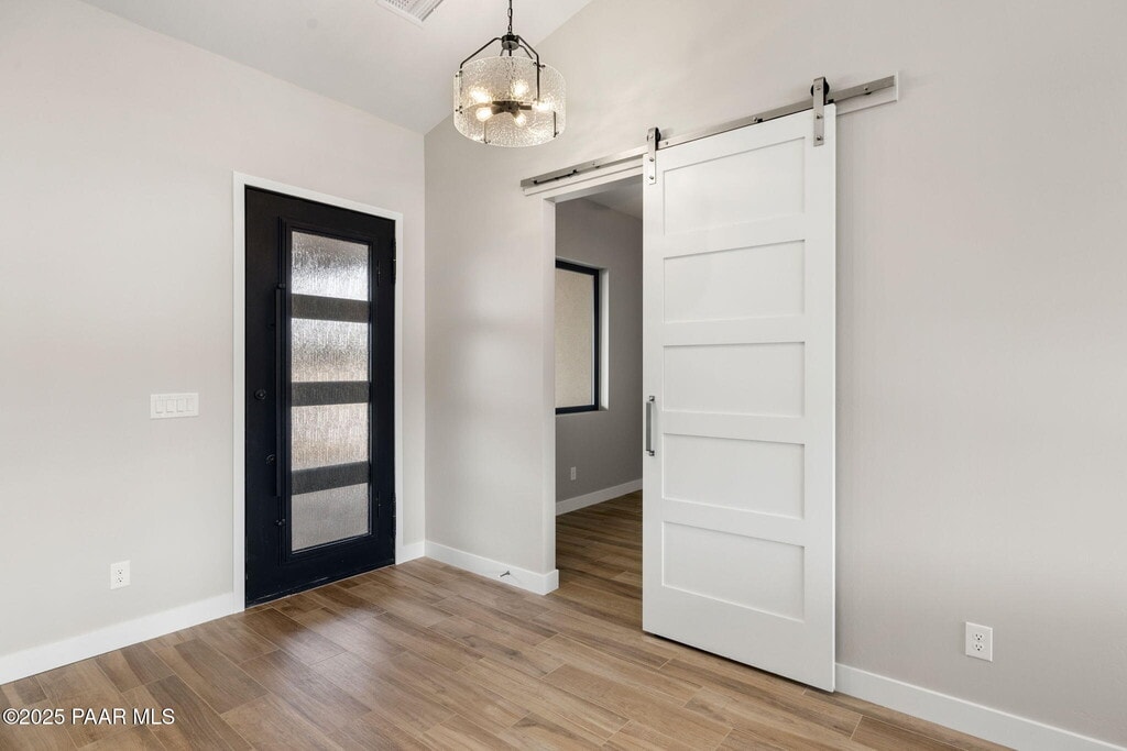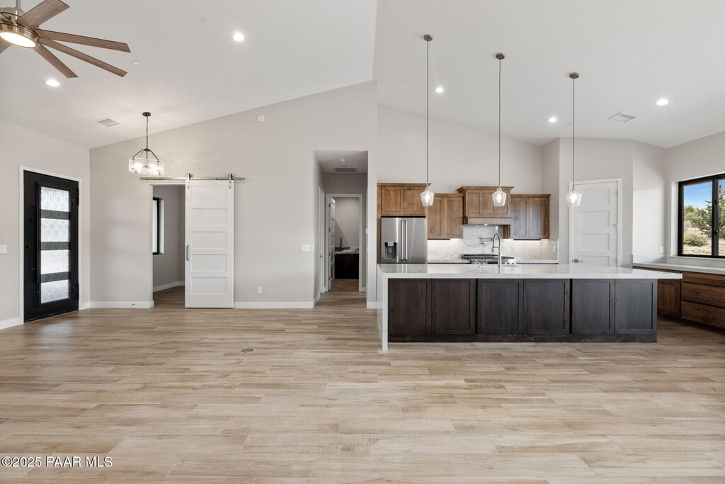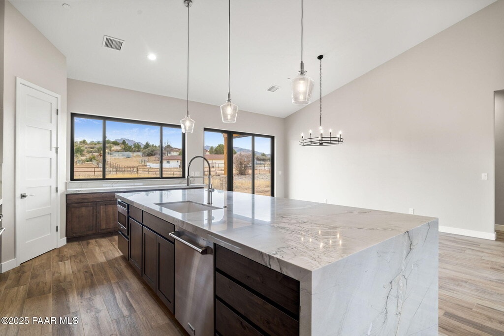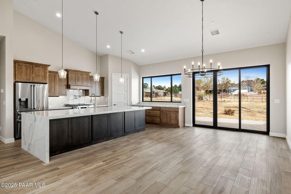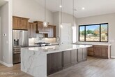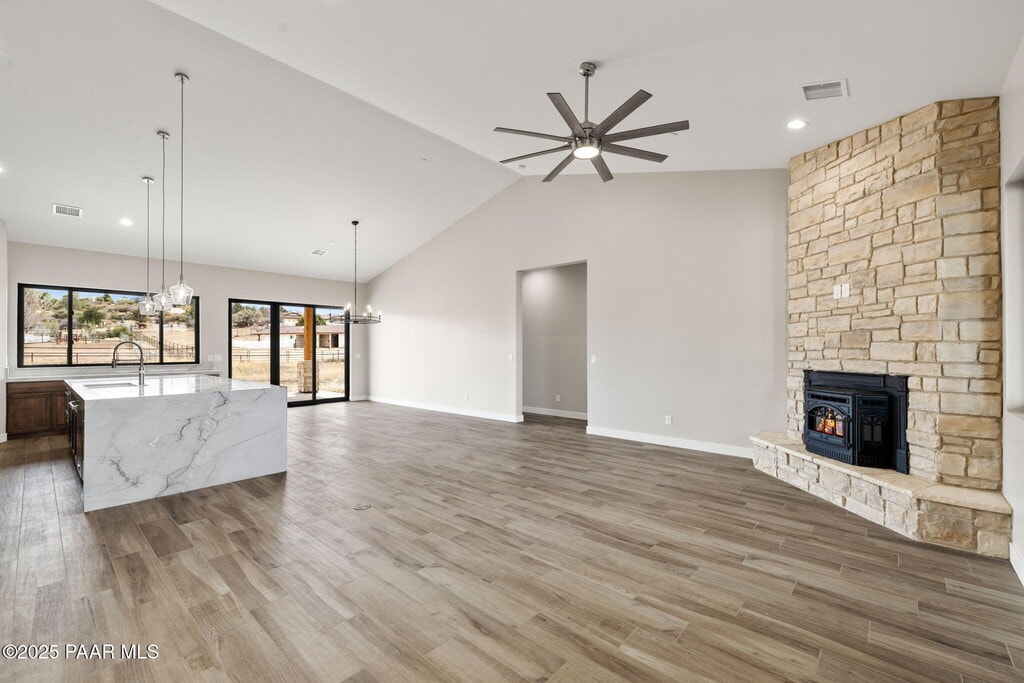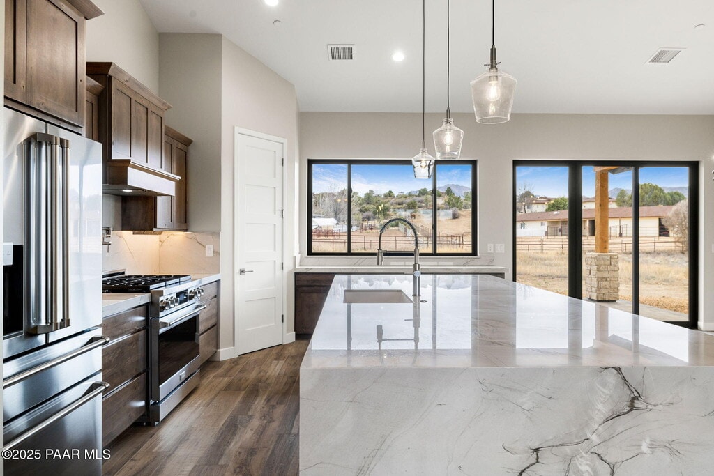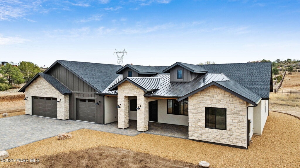 Stunning new custom home in Mint Creek Ranch with breathtaking Granite Mountain views! This 2,394 sq ft residence sits on 2.23 fully fenced acres with a security gate,offering 4 bedrooms plus an office,4 bathrooms,and an oversized 3-car garage. The open floor plan features vaulted ceilings and modern large plank wood-look tile flooring,complemented by plush carpeting in the bedrooms. The chef's kitchen boasts a spacious quartzite waterfall island,matching backsplash,custom knotty alder cabinetry,and premium Thor appliances,including a 6-burner gas range. Relax by the thermostat-controlled pellet-burning stone fireplace. Enjoy the outdoors on the covered paver front porch and back patio,both adorned with tongue-and-groove cedar ceilings.