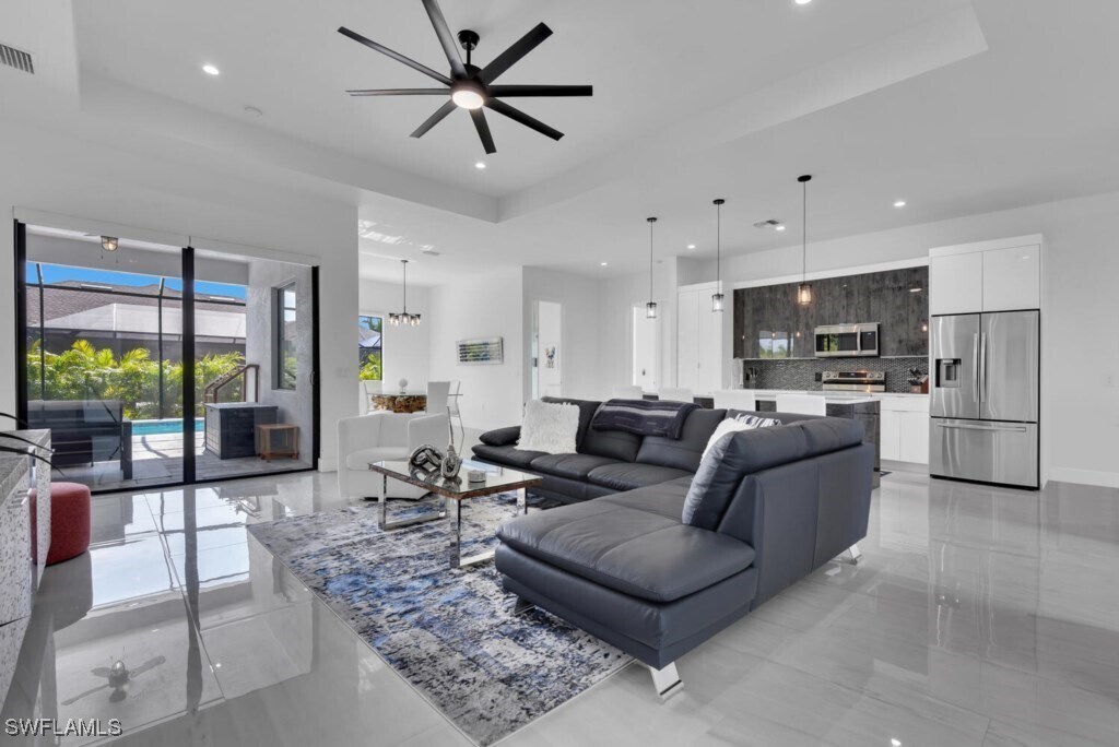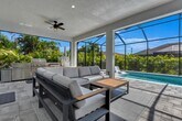 The Vacation Location,is the ultimate Vacation Location for your visit to Cape Coral! This luxurious newly built home is perfectly appointed with stylish funishings and modern technology. Begin your day sipping a cup of java on the spacious lanai viewing the sun rise over the East facing heatable pool. Cool off in a water submerged lounger or dine al fresco using the outdoor food prep area complete with a pizza oven! Stroll to the Lobster Lady Plaza and enjoy the variety of restaurants and boutique shops. Inside,you will find a light-filled,open concept living area. Three bedrooms plus an office offers privacy for all. Cozy up on the couch with a large screen TV or take a break with a book on the sectional near the pool. Located in the popular SW with a multitude of dining and shopping options. Linens,towels,BBQ,pool toys,etc. make this your home away from home – just bring your swimsuit! Pool heat available for $25/day; reduced monthly rate available. There is no garage access but there is parking in the driveway.