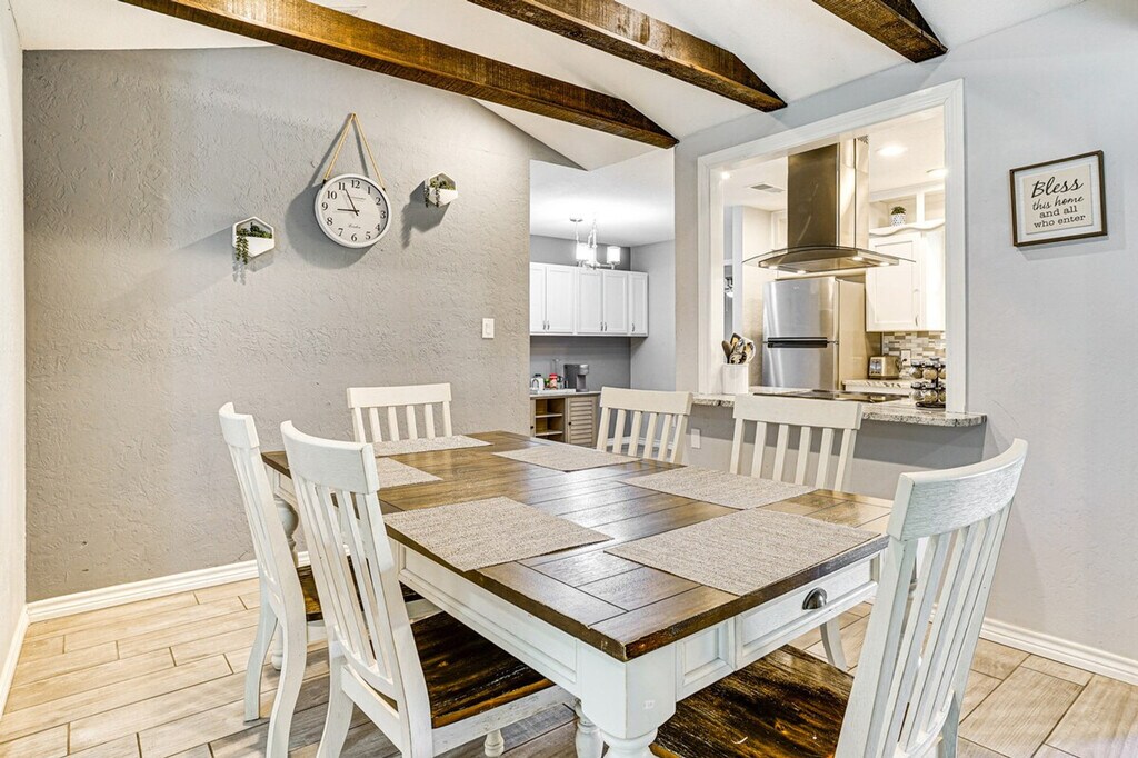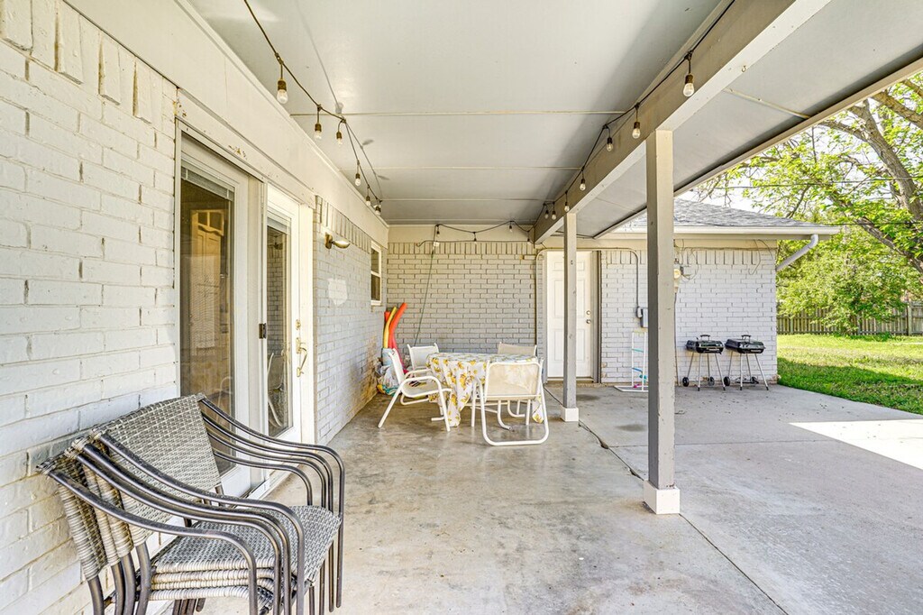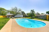 Feel at home in this relaxing Texas retreat, a charming single-story, step-free access 3-bedroom, 2-bath house in Wichita Falls. This home features a fully equipped kitchen with stainless steel appliances, cooking basics, a Keurig coffee maker, dishware, flatware, a full knife set, a microwave, a toaster, and an ice maker. Enjoy smart TVs with cable, a game room with foosball, ping pong, and pool tables, a dining table, a wood-burning fireplace, cathedral ceilings with exposed beams, linens, towels, complimentary toiletries, hair dryers, central air conditioning and heating, a washer and dryer, keyless entry, trash bags, and paper towels. The outdoor space includes an in-ground pool (depth 3' - 8'), lounge chairs, a large fenced-in yard with a pear tree, and a covered patio with a dining table, grill, and string lights. Pets are welcome with a $250 fee. Enjoy the cooler weather on the patio, then go hiking and biking at Lake Wichita Park. The home is equipped with free Wi-Fi (450+ Mbps download speed). No events, parties, or large gatherings are allowed. This property features 2 exterior security cameras located on the front door and pool area, all facing outward. They do not look into any interior spaces. The cameras record video and sound when activated by motion. They will record when they first sense motion and 30 seconds after the last motion is detected. Includes a laptop-friendly workspace. Guests will have access to the entire property via keyless entry. [SI]