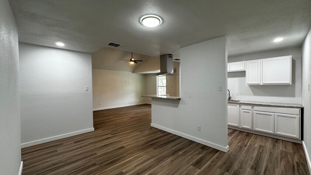 This fenced in remodeled home is located in the Central City area, offering approximately 1,074 square feet of living space on a 7,144-square-foot lot featuring 3 spacious bedrooms with ceiling fans and 1 bathroom. The kitchen features a clean, modern design with bright white shaker-style cabinets, light granite-look countertops, and a sleek stainless steel undermount sink paired with a dark gooseneck faucet. A central peninsula adds extra space while visually opening the kitchen to the adjoining living area.