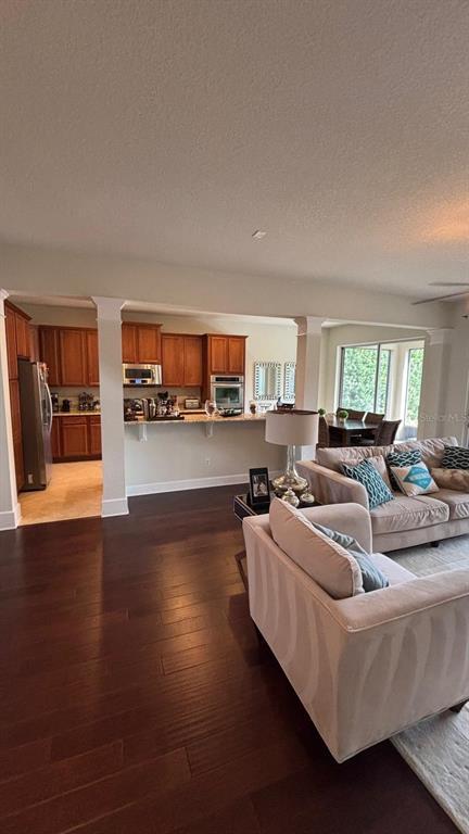 Beautiful 2-story home featuring 5 bedrooms plus a bonus room and 3.5 bathrooms in the gated Meadow Ridge community. The home showcases scraped hardwood floors throughout the foyer,great room,dining areas,and hallways. The spacious kitchen opens to the great room and includes granite countertops,stainless steel appliances with double oven,abundant cabinetry,a breakfast bar,and a large dining area. The first-floor master suite offers crown molding,a large walk-in closet with center island,and a luxurious bathroom with granite counters,dual sinks,a garden tub,and separate walk-in shower. Upstairs you’ll find four additional bedrooms,a bonus room,and two bathrooms with granite finishes. Enjoy outdoor living on the screened lanai with brick pavers,along with a paver driveway and walkway. Additional features include a spacious laundry room with utility sink. Located in the gated Meadow Ridge neighborhood,close to shopping,dining,major highways,and attractions. Community amenities include a pool and playground. MLS# S5144749