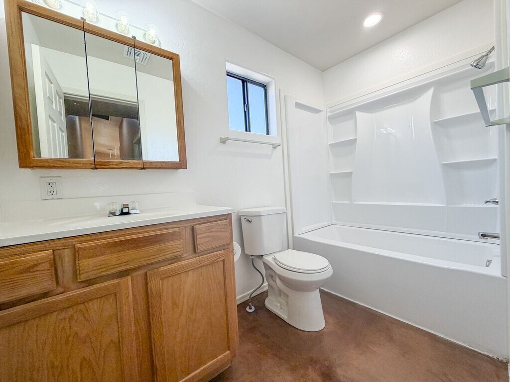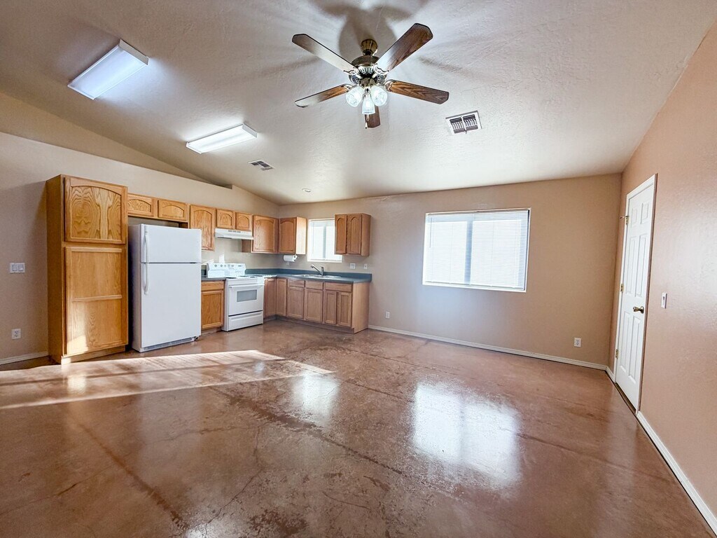This home features an open floor plan with cathedral ceilings, stained concrete flooring for easy cleaning, and a stack washer dryer. The kitchen is equipped with oak cabinets, a full-size refrigerator, and a electric range. Additional highlights include ceiling fans in both the living room and bedrooms A/C and heat, a walk-in shower and keyless entry. There is blinds though out the home. Enjoy a private, fully fenced backyard along with an exterior storage closet. Tenants are responsible for electric and water. May allow a small pet with approvable application. Managed by Foothills Property Management; apply online at or call , M-F, 9 AM–5 PM., 9 AM–5 PM.