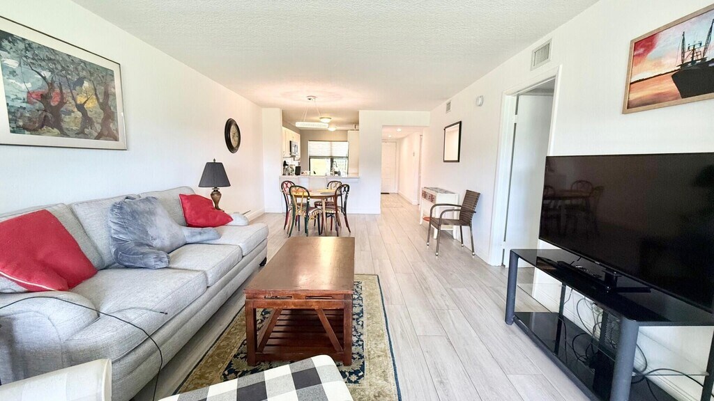 Bright and modern ground-floor 2 bedroom, 2 bathroom residence, fully equipped for a relaxing winter stay. The updated kitchen features sleek quartz counters and stainless steel appliances. Luxury vinyl plank flooring runs throughout the home, creating a clean and stylish look. Enjoy peaceful views of the garden and golf course from the screened patio enclosure. The spacious primary suite offers a large walk-in closet, while the split floor plan provides comfort and privacy for guests. Ideally located in a private setting just minutes from premier dining, shopping, and entertainment options.