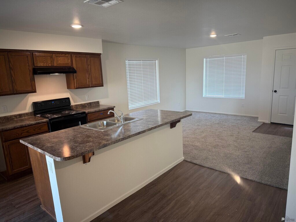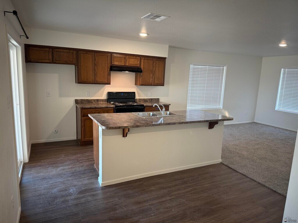 Brand new rental property! Never been lived in. You can be the first in this 3br, 2ba home with 2 car garage. Kitchen island with sink, dishwasher, and electric range/oven. Carpet throughout except kitchen, dining room and bathrooms. Blinds throughout the home. Backyard will be fenced in sometime in the next few months. Front yard will be landscaped with rock and one tree. Landscaping will be on an automatic timer. Garage has an opener.