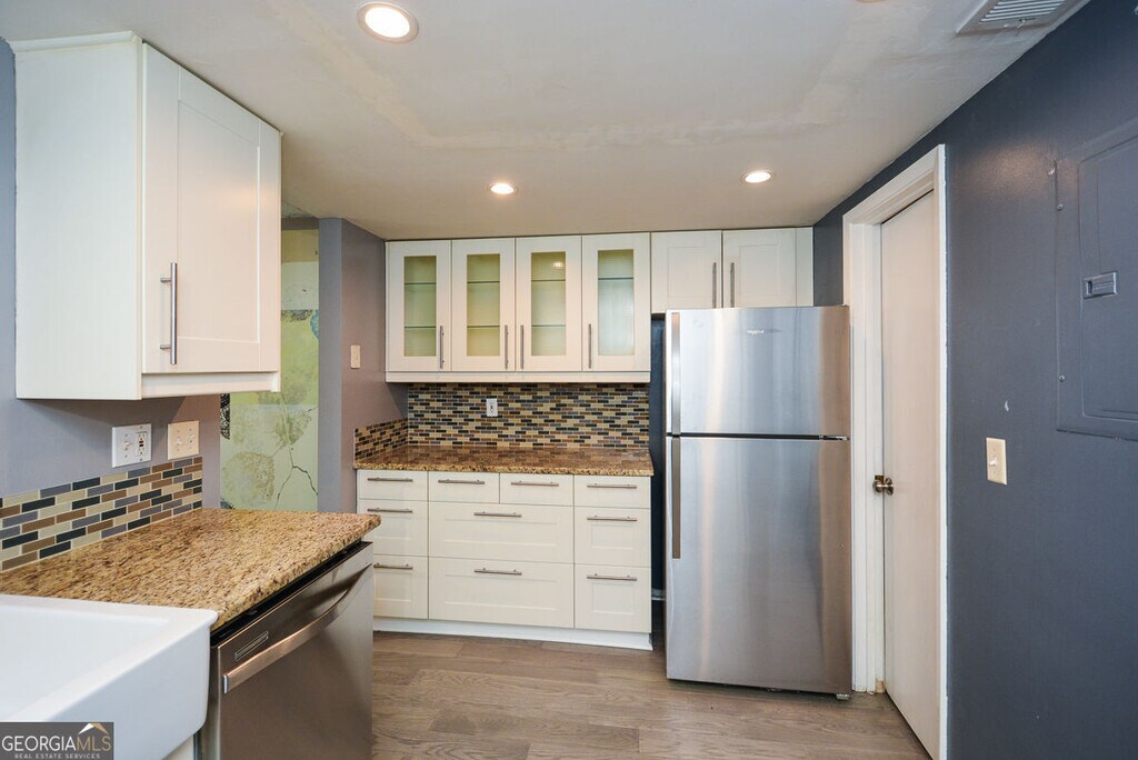 Welcome to this beautifully updated 2-bedroom, 2-bath condominium offering the perfect blend of modern comfort and prime location. Just minutes from Truist Park and The Battery Atlanta, this home provides effortless access to top dining, shopping, and entertainment while maintaining a peaceful, tucked-away feel. Step inside to a bright and inviting open floor plan with thoughtful updates throughout-accent walls, recessed lighting, and a cozy fireplace that adds warmth and character. The kitchen features granite countertops, stainless steel appliances, a farmhouse double-bowl sink, a convenient coffee bar, and a spacious pantry, making everyday living both functional and stylish. The primary suite offers a comfortable retreat with an updated ensuite bath and stepless shower. Both bathrooms reflect a clean, modern design. A private covered patio with extra storage creates the perfect space to relax and unwind. Enjoy all the community amenities including a sparkling pool, tennis courts, playground, lake, and fitness center. With its ideal location and move-in-ready appeal, this home offers an easy lifestyle close to everything Smyrna and Atlanta have to offer.