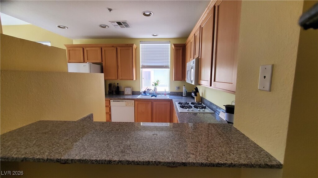 FULLY FURNISHED APPLIANCES, COOKWARES, KITCHENWARES Ready to move-in. GUARD GATED LUXURY PARK AVENUE CONDO w/ ELEVATOR. Great LOCATION SOUTH LAS VEGAS Few blocks frm South Point Hotel & 5.8 miles to NFL Allegiant Stadium,TMOBILE ARENA. Easy access 215/1-15 Frwy. Corner unit 3rd Flr Large Balcony w/storage closet, facing west w/views of community.Tiled Entry FOYER w/ Coat closet leads to living next to Dining surrounded by 2 Large Windows. Kitchen w/maple cabinetry, granite countertops, breakfast bar built-in oven gas cooktop Recessed lightings.Window over sink gives natural lights Primary BR King sized bed, custom built ceiling w/fan. Primary BA Tub/shower Double sinks, make-up area & walk-in closet. Other side has pocket door that closes off the section of unit includes 2nd BD & Walk-in closet, Full BA & Laundry closet.Equipped w/SALT FREE WATER SOFTENER FILTRATION SYSTEM. Ground flr assigned parking sp Enjoy Amenities:Event Rm Tennis Ct Out/Indoor POOLS SPA 2 stry GYM Sauna/Steam Rm.