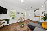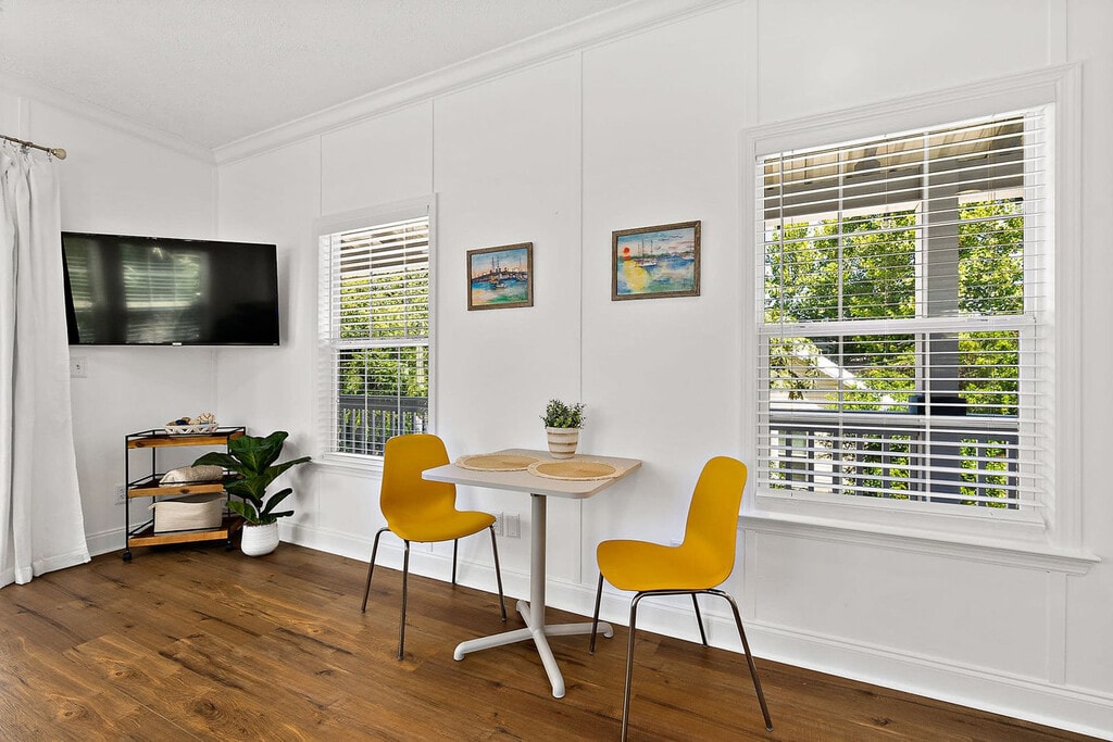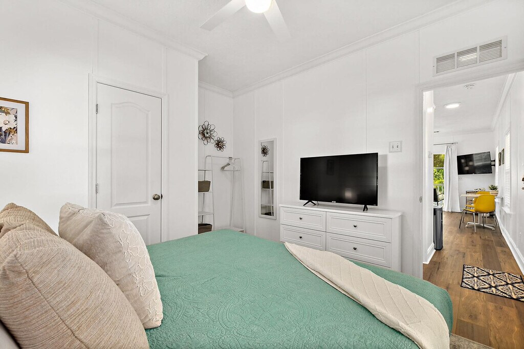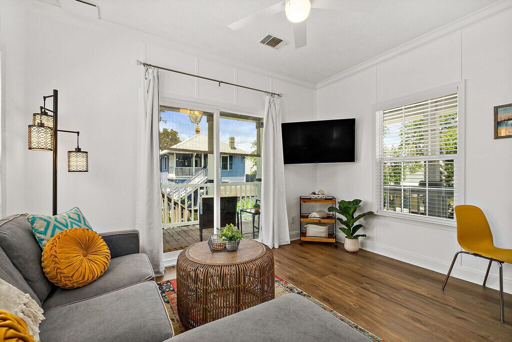 Feel at home in this charming treetop cottage, located in the heart of the leafy historic district. This eclectic and modern designed cottage features bright sun-filled living. The cottage features a fully equipped kitchen, a generous king-size bedroom, and a sparkling bathroom. The living area includes a plush chaise lounge and a large wall-mounted Smart TV with Netflix access. The bright, open kitchen is fully equipped with a full-size fridge, an oven and stovetop, a built-in microwave, a coffee maker, and a dishwasher. The calming bedroom offers a luxuriously large king memory foam bed topped with soft, quality linen and bedding, along with an additional Smart TV. The bathroom includes a relaxing bath and a vanity stocked with all the essentials and soft, fluffy towels. A free parking space for one car is included with your stay. A complimentary welcome coffee voucher for each guest is available at the cafe. Explore everything this beautiful area has to offer on foot, with restaurants and attractions all just a short stroll away. The apartment is just blocks from downtown and all the popular attractions, with the Old Town Trolley Stop right out front. St. Augustine is the nation’s most historic city and offers flavorful dining, art, and culture with an abundance of entertainment right on your doorstep. The house is just 3 blocks from Castillo de San Marcos, 3 blocks from St. George Street, and a 5-minute walk to the bayfront. Quiet hours are between 9:00 PM and 8:00 AM. The minimum age to book is 21. The primary guest on the reservation must be present for the duration of the stay. If you have more guests on the premises than you have notated in your reservation, we reserve the right to charge an additional fee. This home is not suitable for parties or any other large group gathering. Any guests visiting outside of the reservation must be approved by hosts prior to their arrival. Quiet hours are from 10 PM to 8 AM per St. Johns County ordinance and are enforced. In addition, any guests outside of the reservation must vacate the property during this time. The home has an actively recording security camera installed at the front door of the home. An attempt to remove, tamper, or disconnect the internet to Ring may result in the reservation being canceled and guests requested to vacate the premises. Do not move furniture, appliances, or décor from where you found it upon check-in. Outdoor furniture must be returned to its original positioning in which you found it upon check-in. No pets are allowed on the property at any time. Guests who stay past checkout time will be charged an additional fee of $50/hr. No vaping or smoking is allowed whatsoever on the property, including the front porch, and if evidence of smoking is found, you will be subject to an additional cleaning fee. Illegal drugs are strictly prohibited. Do not flush anything down the toilet except toilet paper. Renters are 100% liable for any and all property damage, caused by themselves or guests, during their stay. You are required to follow the House Rules written here and posted in the house during your stay or risk being removed from the property. Any excessive mess will result in loss of security deposit in the additional amount that is needed to pay cleaners. [SI]