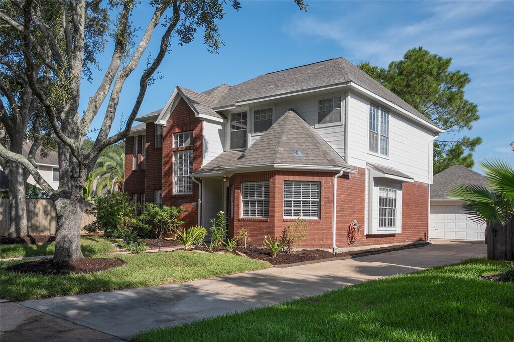 Don't miss this charming brick house two story in the 24 hour manned gate,Golf Course Community of South Shore Harbour! Spacious 4/2.1/2 with large walk in closets. Entrance has two story foyer & entrance hall. Warm fireplace in the living room is a great focal point,with a wall of windows overlooking the backyard with concrete patio. Formal dining & breakfast rooms frame the kitchen. Kitchen with granite countertops,table island,gas range,double oven and large pantry,tons of cabinet & counter space. Detached garage w/ table workshop. Upstairs you'll find 3 bedrooms with new carpet & 1full bathroom,a large gameroom w/ linen/storage closet. Lash landscaping with front Sprinkler System,Explore the neighborhood with tennis & basketball courts,pavilion,pool & splash pad. For a separate fee,become a member of the South Shore Country Club,inside the neighborhood! CCISD schools. No MUD taxes! Never flooded! Freshly painted inside and outside. MLS# 26530351