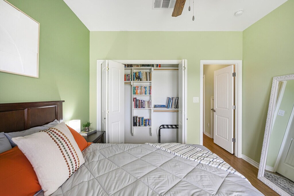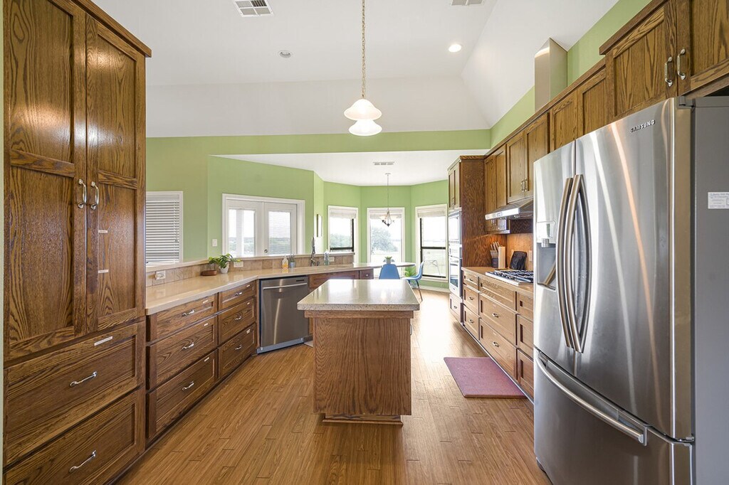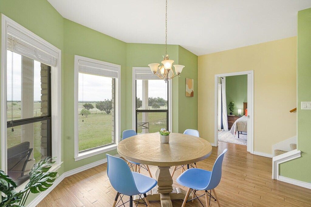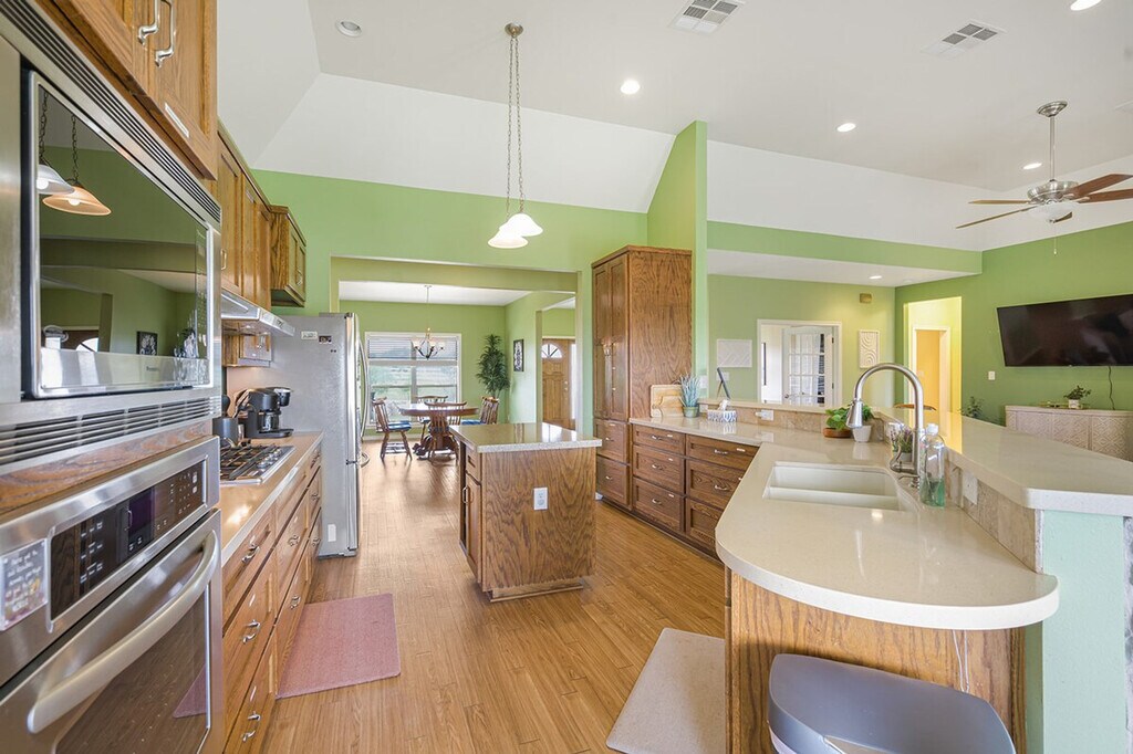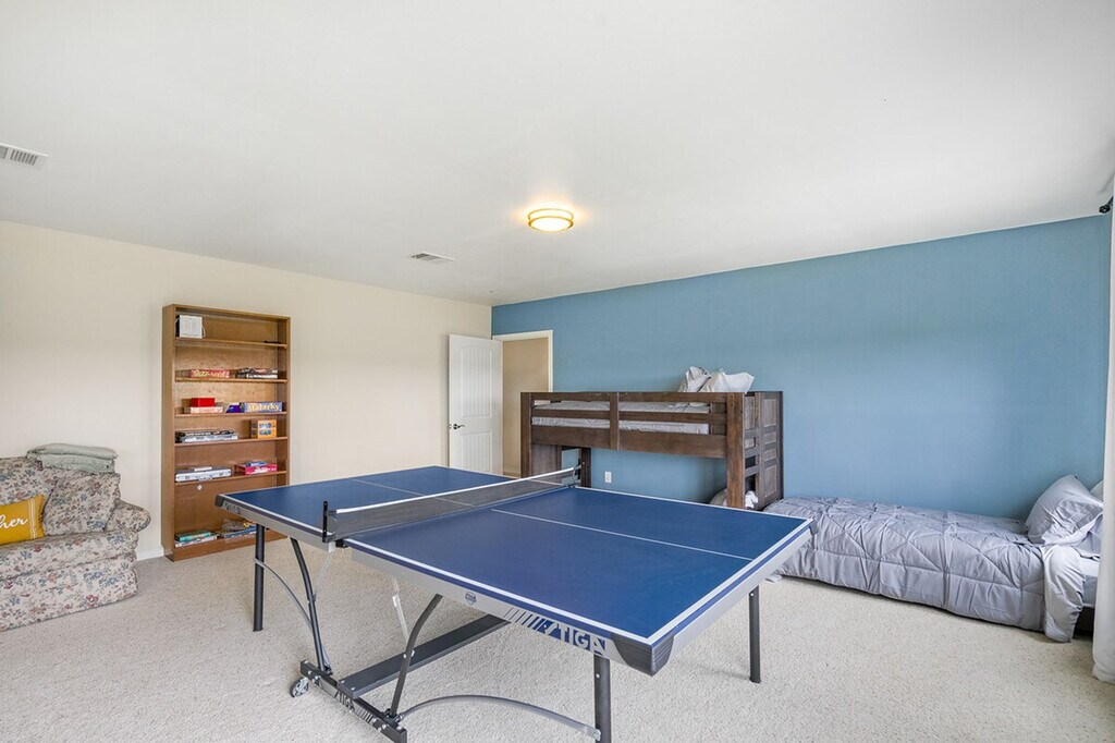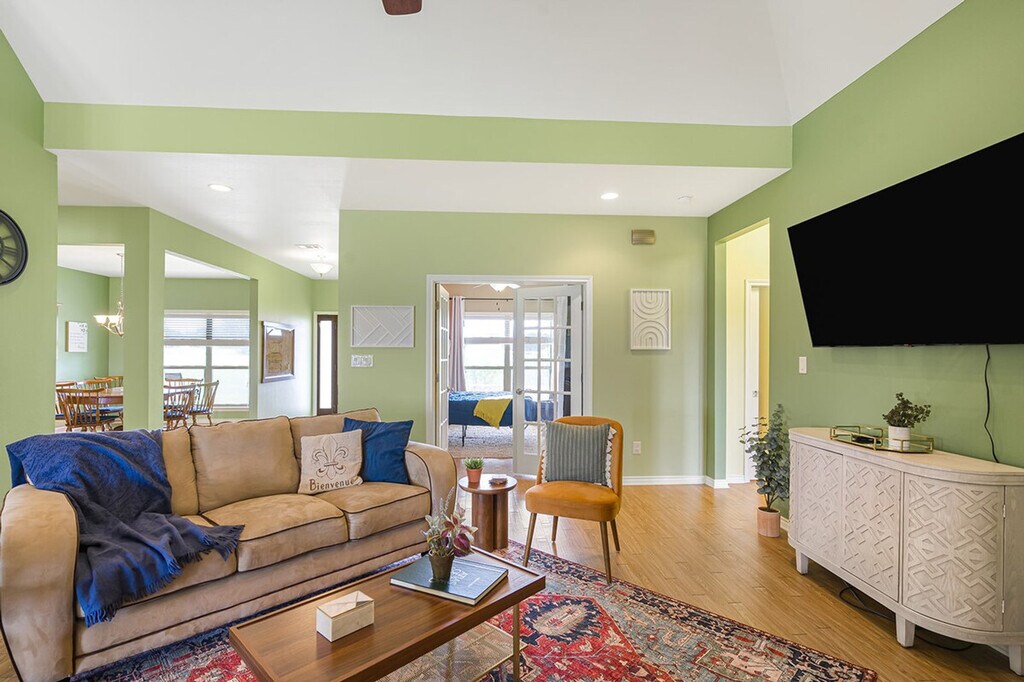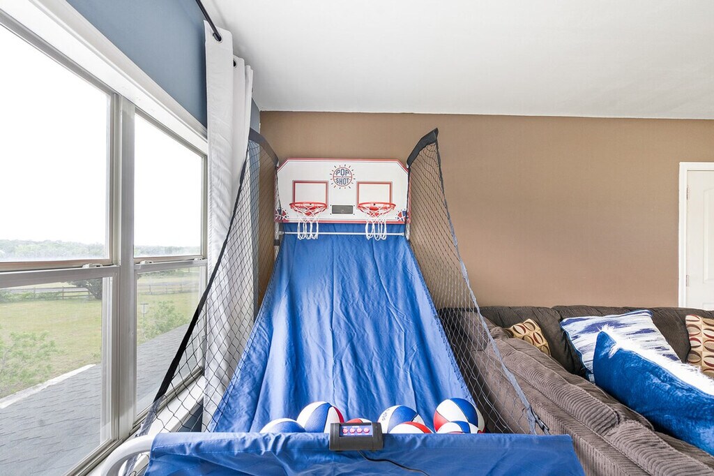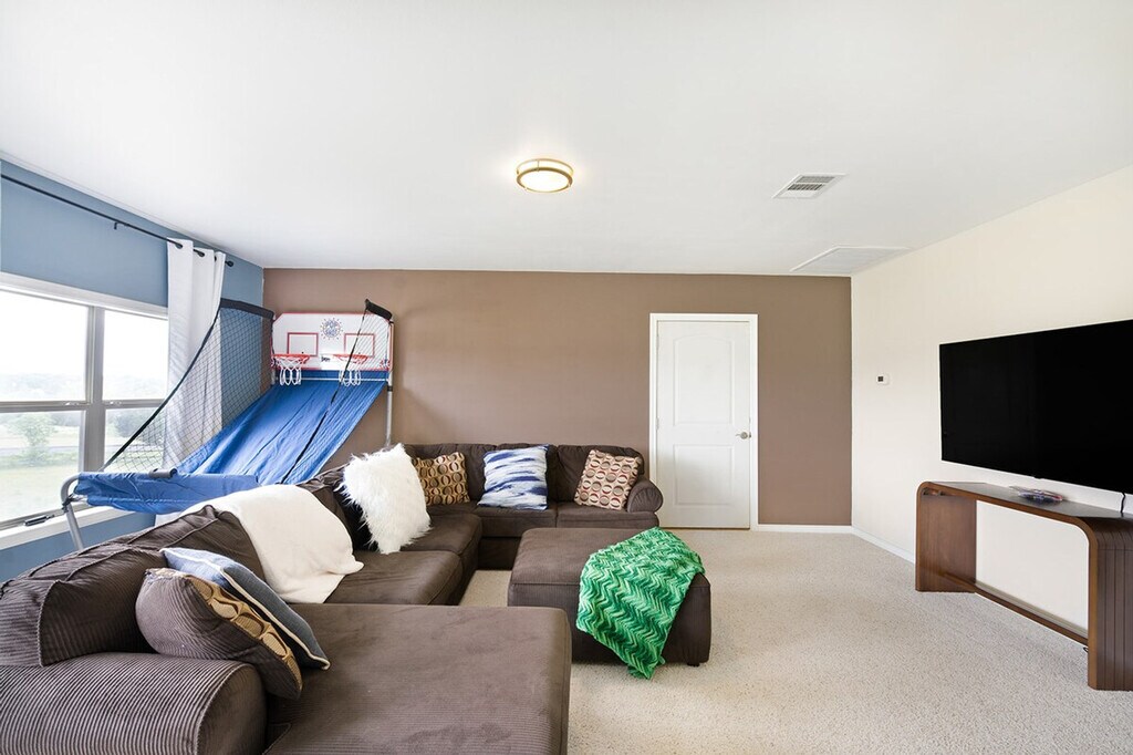 Welcome to this inviting family home nestled in the heart of the Texas Hill Country, offering 14 acres for your enjoyment. This spacious property is perfect for families and groups looking to unwind and have fun, featuring a disc golf course, wiffle ball equipment, a fire pit, and stunning panoramic views of the Liberty Hill Countryside. Inside, you'll find a large master room with a king-size bed, double patio doors, and blackout curtains. There are two guest rooms with queen beds and blackout curtains, and a large game room with three twin beds, a pull-out sofa bed, a queen air mattress, and a large couch. The fully equipped kitchen includes all essentials, an ice cream maker, and a griddle. The game room offers ping pong, basketball, board games, and more, while fast Starlink internet ensures connectivity. Guests have access to the entire fenced-in area on the property. The property is home to goats and herding dogs, so guests are asked to stay within the 3-acre fenced-in perimeter at the front part of the property. Guests are encouraged to enjoy the full wiffle ball field, outdoor fire pit, custom disc golf course, and game room with basketball and board games. A laptop computer is not included.