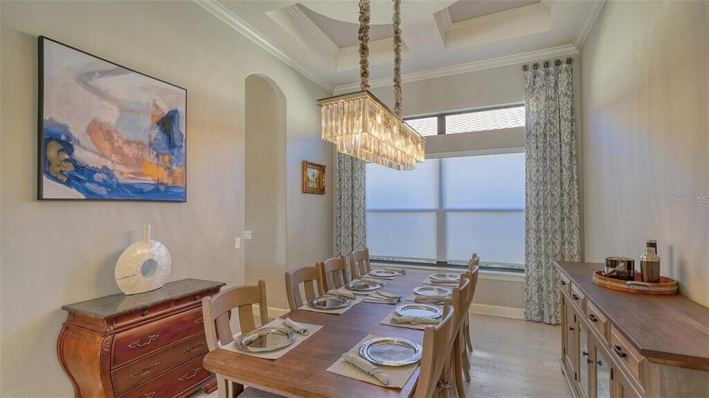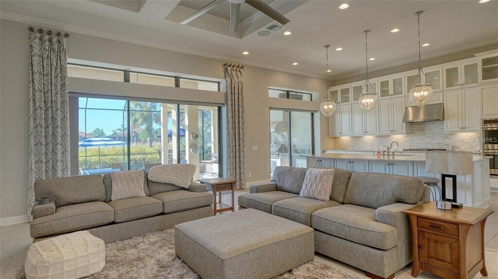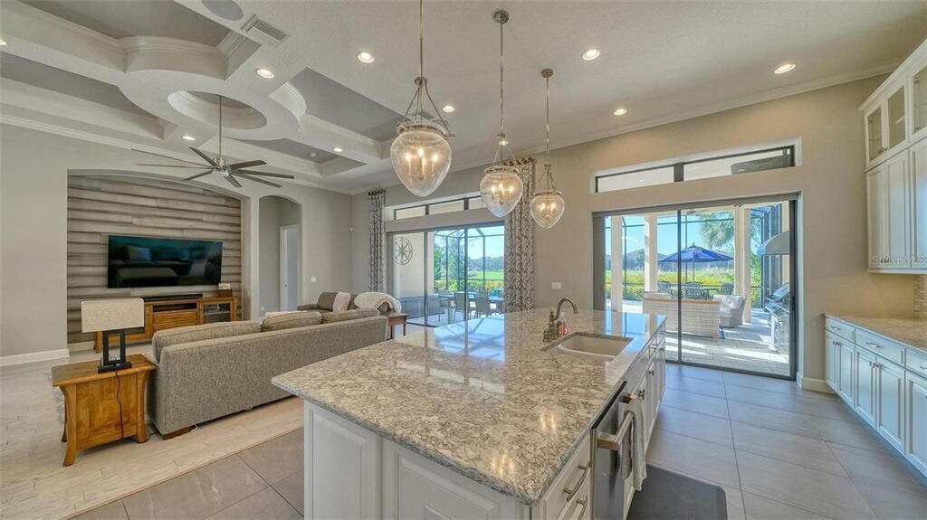 One of Taylor Morrison's great builds in Esplanade of Lakewood Ranch. This singe family home has soaring decorative ceiling through out the entire house with no carpet just upscaled flooring throughout. The volume in this open floor plan is all bright nature sunlight which makes great for gatherings. The dry bar with wine cooler,booze mixer and latte maker is next to the formal dinning area for all of your guest needs. The office/den is delightful with an oversized work space for everyone. Master bedroom has great views overlooking the pool area,greenery and outstanding sunsets. The over sized kitchen is not missing anything for your chef at work with double built in ovens,gas iron cooktop with stainless hood,more then enough tall white cabinets and stone counter top work space galore. Let go outside to the best outdoor living space you could ask for. Nice big covered area with full outdoor kitchen and grilling area with hung TV to watch. No one will be left out as many areas to stretch out on lounge chairs or seating by the fire pit table to enjoy. MLS# A4678751