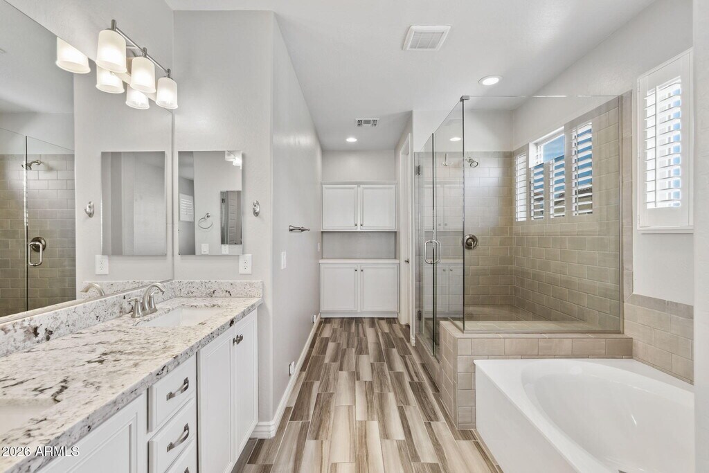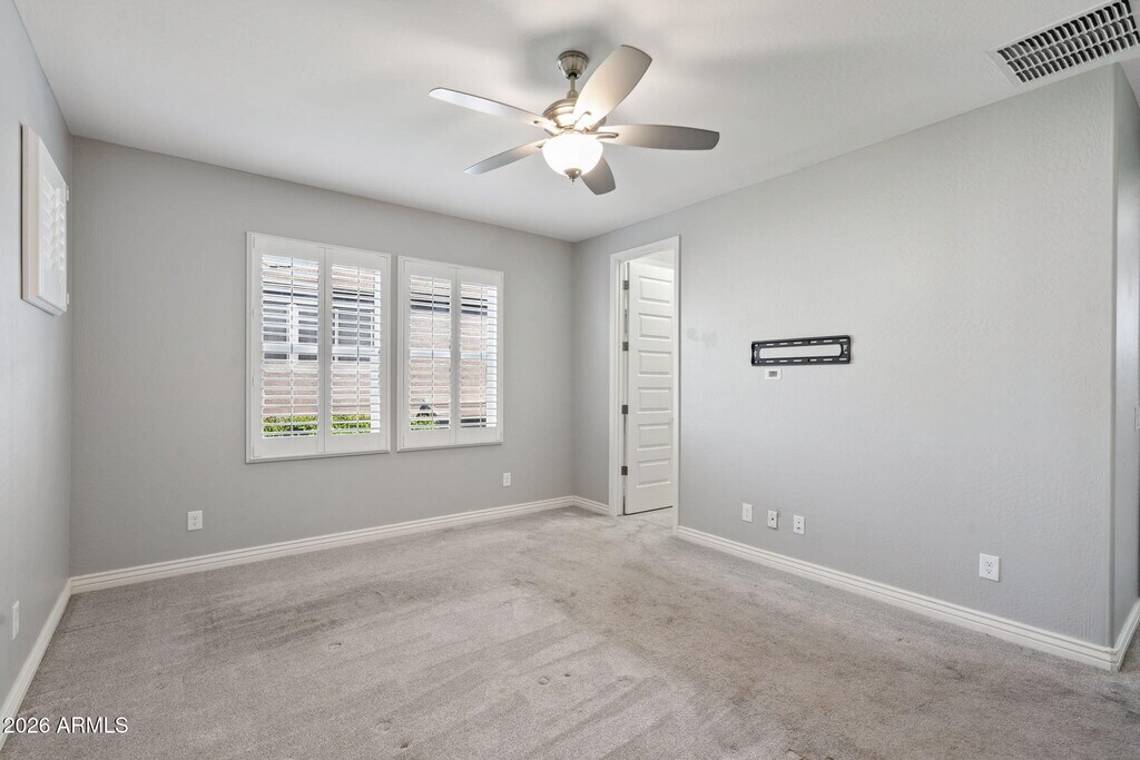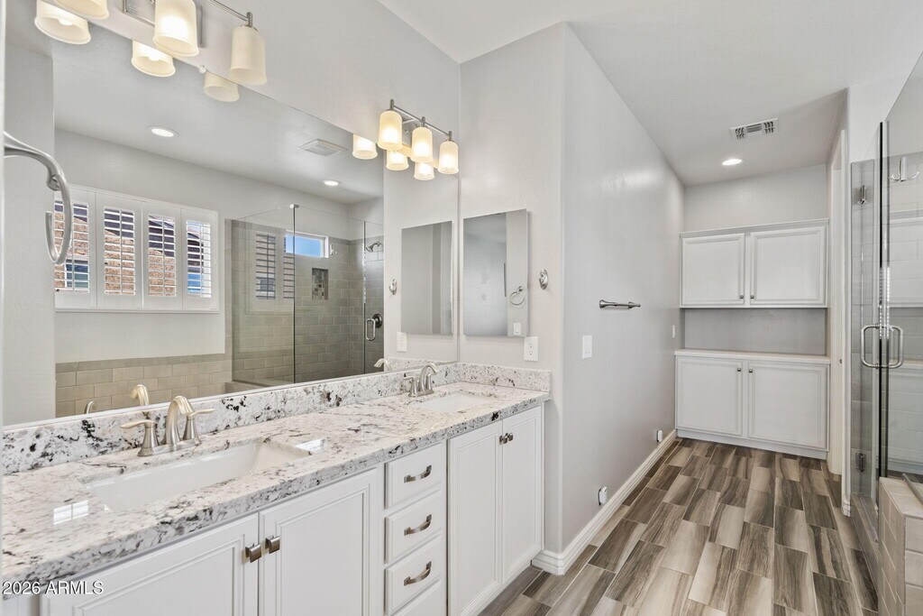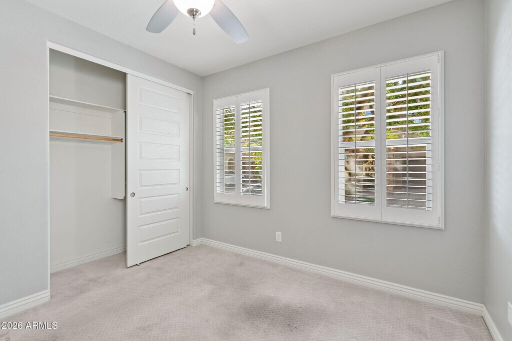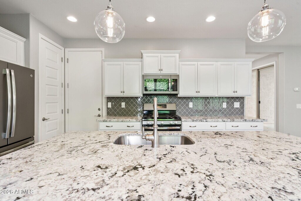 New opportunity in The Sanctuary of Desert Ridge. The main floor includes a mother-in-law suite and an open kitchen equipped with white cabinets with crown molding,granite countertops,stainless steel appliances,Restoration Hardware pendant lighting,and a custom tile backsplash. Upstairs,you'll find an oversized master bedroom with two walk-in closets and master bathroom with stunning tile work,a glass shower door,his and hers closets,and upgraded fixtures. Another spacious guest room and laundry room are located upstairs. The outdoor area features a private courtyard,a putting green,and a sparkling Shasta self-cleaning pool with water features and lights. Weekly pool service is included. Enjoy the miles of maintained trails throughout Desert Ridge & high street. This home is in pristine,move-in ready condition and close to all shopping,entertainment and schools.