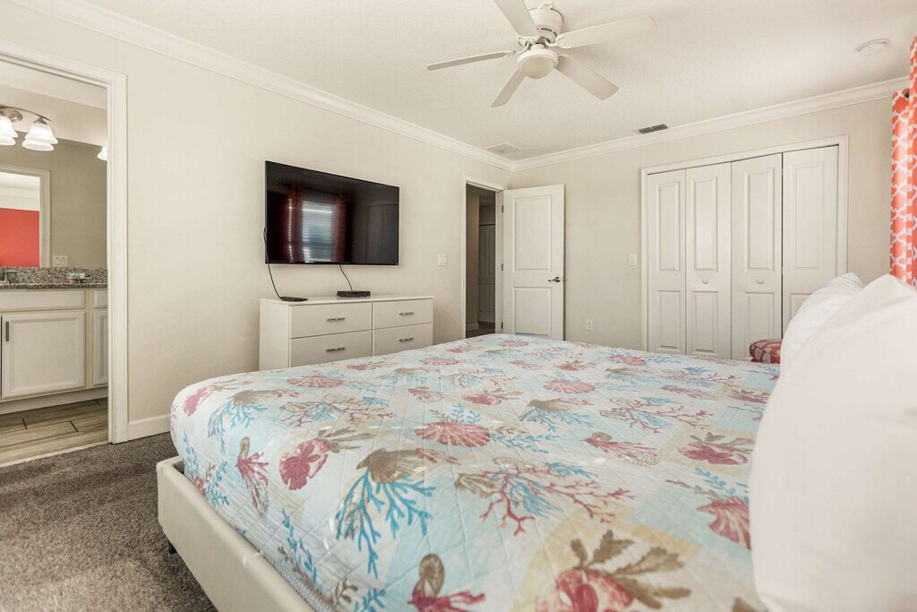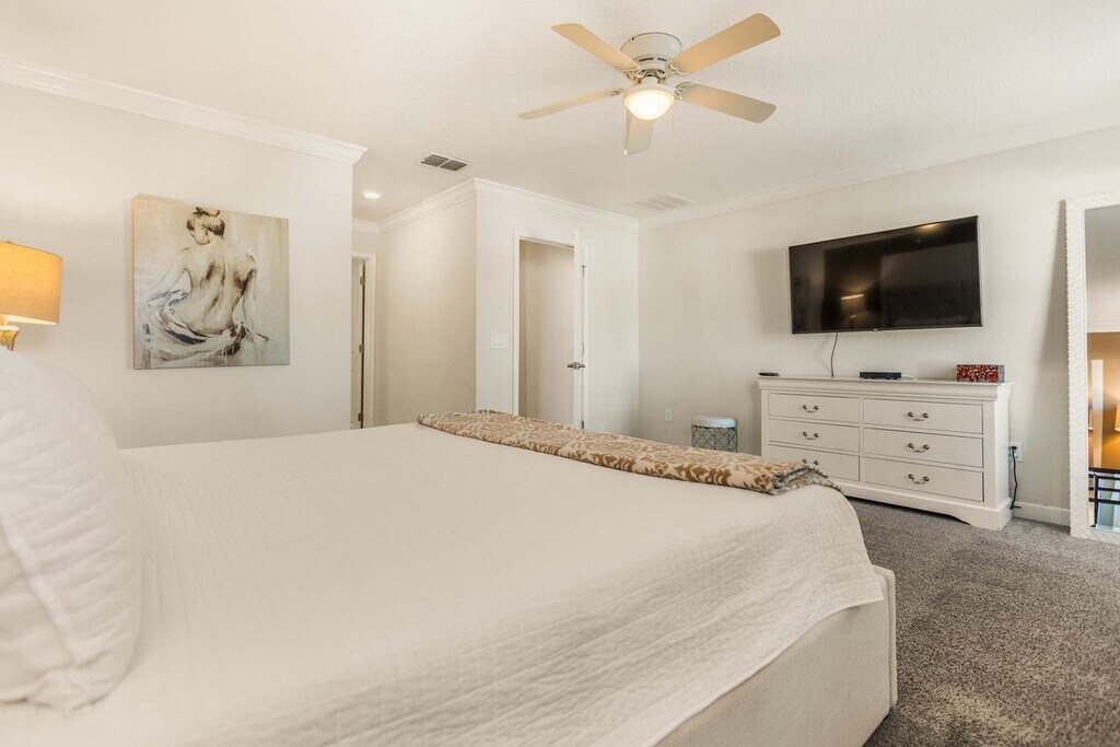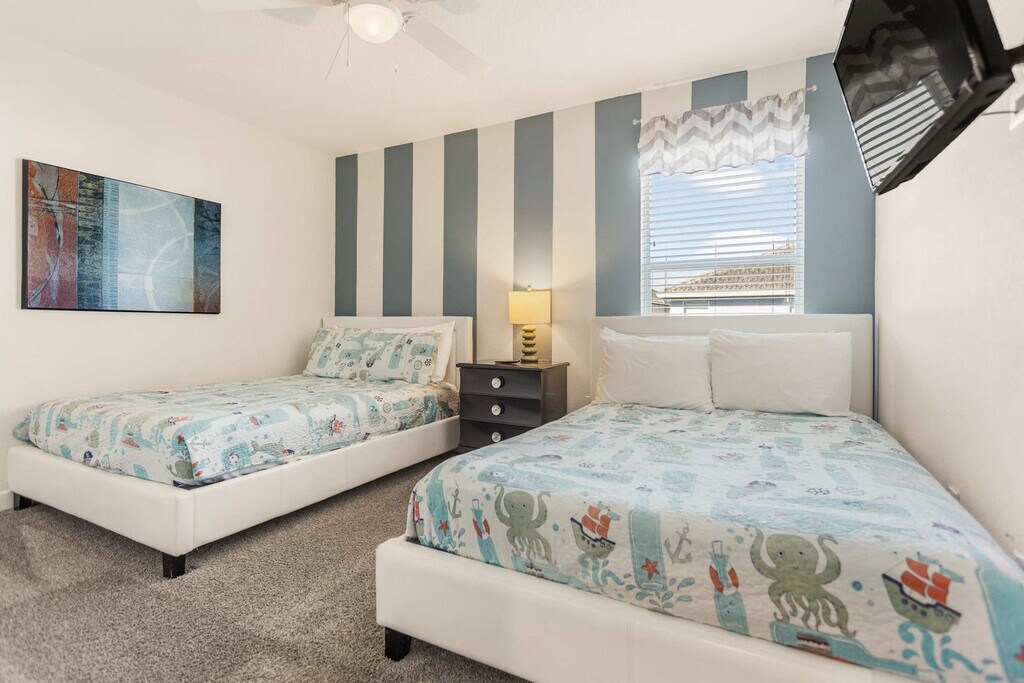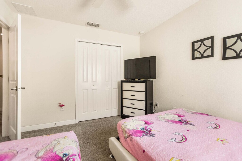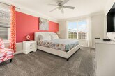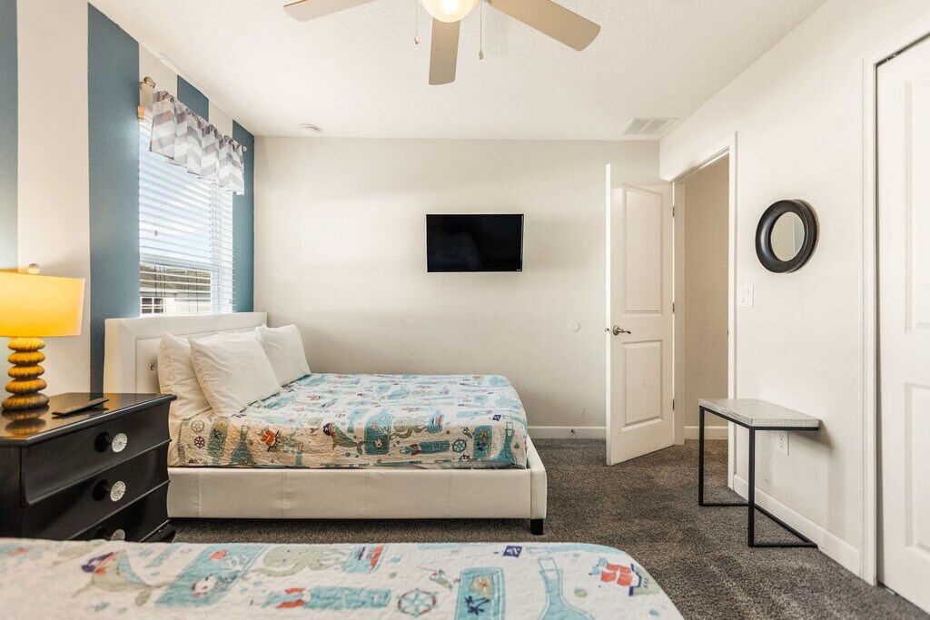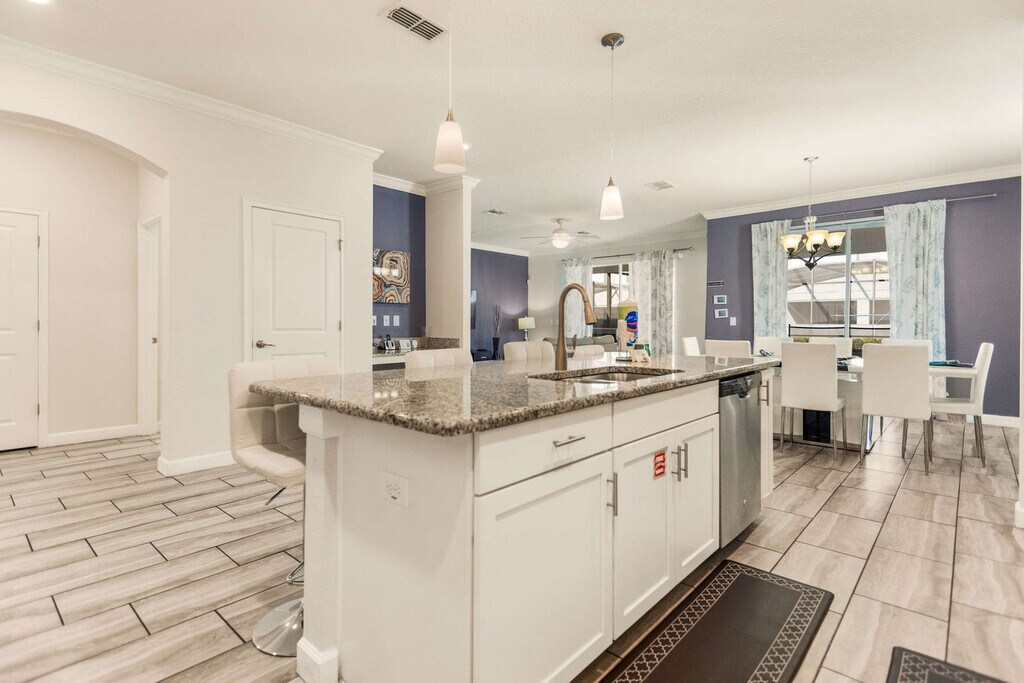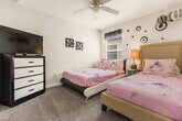 Feel at home in this 6-bedroom home located in Storey Lake Resort in Kissimmee, just 15 minutes from Orlando's main attractions like Disney World. This home provides comfort for any family or travel party. The fully equipped kitchen has all the necessary equipment and tools to prepare any type of meal. Sheets and towels are provided, along with a starter kit of shampoo, conditioner, body soap, toilet paper, and kitchen supplies. The loft living room is designed for family time, and you can enjoy a game of pool, air hockey, or foosball. The home features a living room with a big flat-screen TV and a DVD player, a private screened-in pool, a Jacuzzi, a covered lanai with patio furniture, a dining area, a breakfast bar, a second living area with a big flat-screen TV, a laundry room with a full-size washer and dryer, an iron, and an ironing board. Pool heat can be activated upon request for an additional fee of $45 per night. Pets are welcome with a fee of $150 per pet per stay, and weight restrictions apply. This property is located in Storey Lake Resort, one of the newest resort communities in the Orlando/Kissimmee area, with easy access to theme parks, dining, and shopping. Storey Lake Resort amenities and services include a 10,000 sq ft clubhouse with a state-of-the-art fitness center, a resort-style pool with a kids' splash area, a lazy river, a tiki bar, a fitness center, Tu Casa Bar and Lounge, a market and deli, an arcade games room, concierge services, a sand volleyball court, a multi-purpose court, and a kids' playground. Quiet hours are between 10:00 pm and 7:00 am. Guests must be 25+ years old unless accompanied by a responsible adult. No parties or events are allowed. Only registered guests may stay overnight; a list must be sent prior to check-in. Vehicles parked in violation of parking rules may be towed immediately. Charcoal grills are strictly prohibited due to fire hazards; using charcoal grills may result in a fine of up to $500 and eviction. [SI]