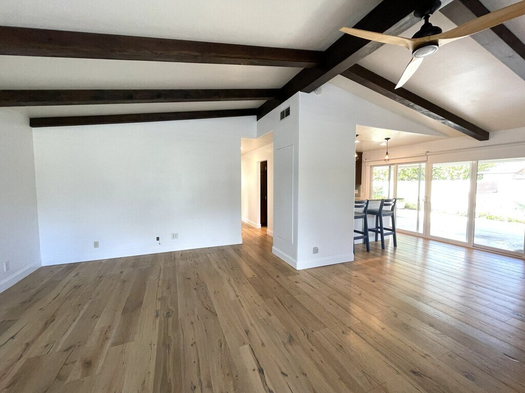 You'll love the warmth of this home with wide plank wood floors, new paint, shutters and nice finishes throughout. The living and dining area has wood beamed, vaulted ceilings and is open to a wall of sliding doors leading to the covered patio and spacious outdoor area with fire pit. The kitchen boasts a breakfast bar, stainless appliances including courtesy refrigerator, 6 burner gas range, microwave and dishwasher, plus plenty of cabinet space. Each of the bedrooms has ceiling fans and closet organizers. The primary bath has an oversized walk-in shower and the hall bathroom features colorful tile and a tub/shower. There's laundry hookups in the 2 car garage, and driveway parking. No smoking, no pets please. Ideally located across from Victor park and less than a mile to elementary, middle and high schools, don't miss out on this ideally located home. Call Marine View Management for appointment to view: .