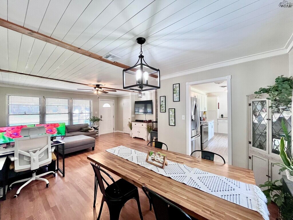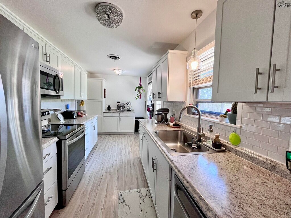 Updated 3BD/2BA/2-car garage home. L-shaped living/dining features a shiplap-style ceiling. Kitchen boasts subway tile backsplash, coffee bar, free-standing electric range/oven, built-in microwave, dishwasher & great cabinet storage. Primary suite offers two generous closets & en suite w/tiled shower & textured glass door. BRs 2-3 share hall bath w/shower/tub combo, vanity & cabinet storage. Laundry in garage w/sliding barn doors. Large privacy-fenced backyard! Available June 1st for move-in. MLS ID 183004
