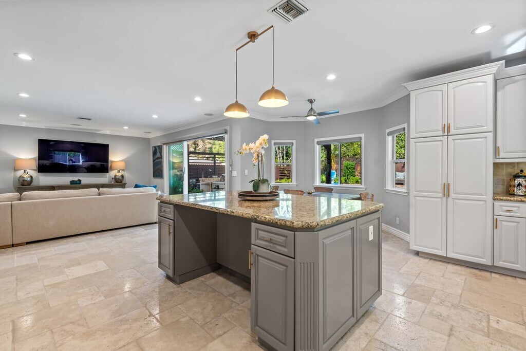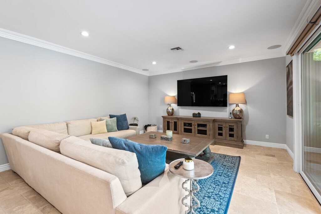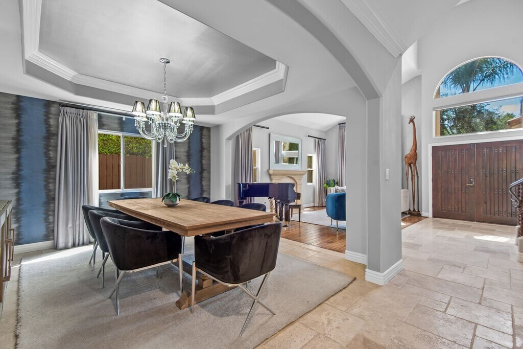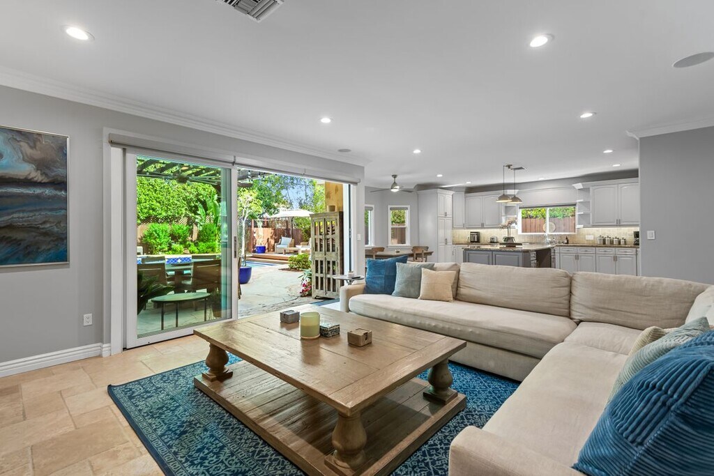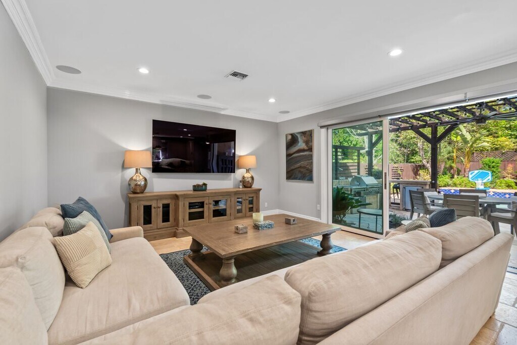 Welcome to 4724 Noble Ave, an exquisite Mediterranean-style residence nestled in the heart of Sherman Oaks. This stunning 5-bedroom, 4-bathroom home spans over 3,311 square feet and delivers the perfect blend of timeless elegance, space, and California indoor-outdoor living. The main level features a chef-inspired kitchen with granite countertops, stainless steel appliances, custom cabinetry, and a large center island ideal for both everyday living and entertaining. Natural light fills the open-concept living and dining areas, highlighted by crown molding and recessed lighting. Thoughtfully designed for flexibility and function, the first floor includes a private bedroom and full bath, ideal for guests, in-laws, or a home office. Upstairs, the expansive primary suite offers a serene retreat with a spa-like bathroom dual closets and a balcony overlooking the backyard. Three additional guest bedrooms, each with their own en suite baths, provide comfort and privacy for everyone. Step outside to your resort-style backyard, complete with a sparkling pool, elevated spa, built-in firepit, and a fully equipped outdoor kitchen, perfect for alfresco dining, weekend BBQs, and entertaining under the stars. Lush landscaping, tranquil water features, and multiple lounging areas complete this private oasis. Additional amenities include central air and heat, an indoor laundry room, gated driveway, attached two-car garage, and excellent curb appeal. The home can also be leased fully furnished, offering a rare turnkey opportunity in a premier location, call for rate details. Located just steps from Ventura Blvd's shopping and dining favorites. With easy access to the 101 and 405 freeways, this location offers unbeatable convenience in a peaceful, tree-lined neighborhood!