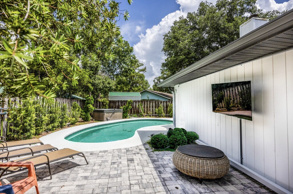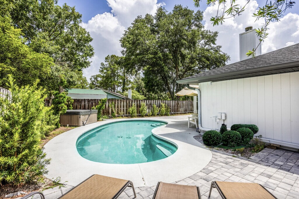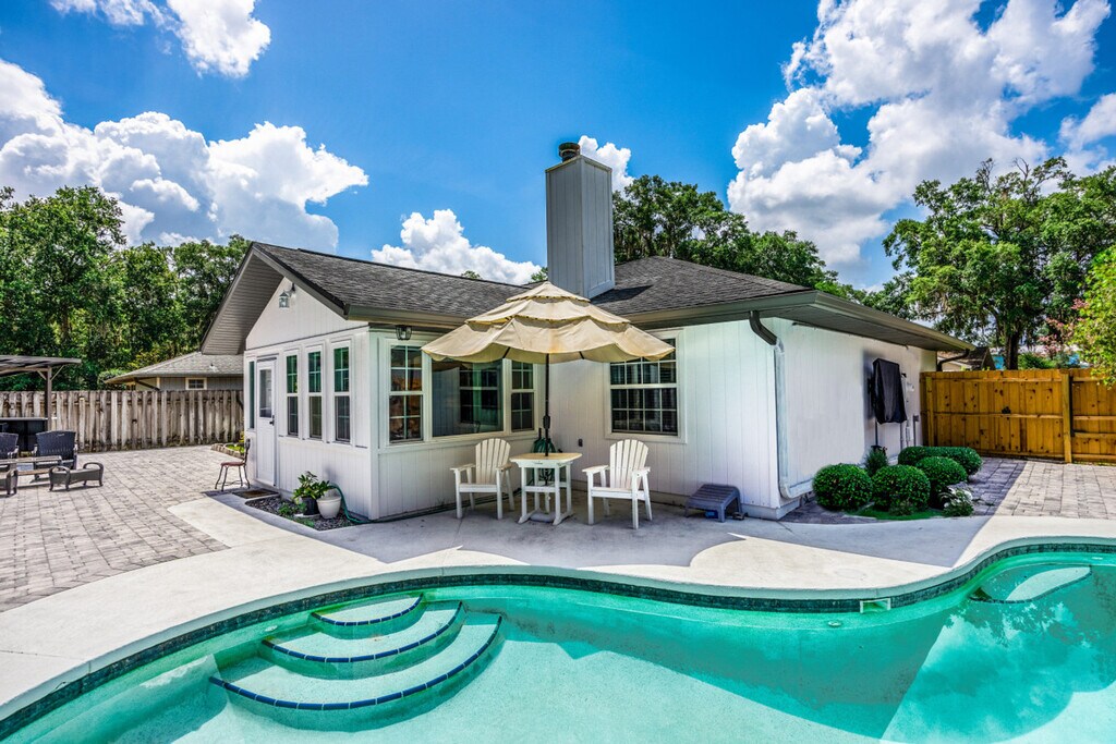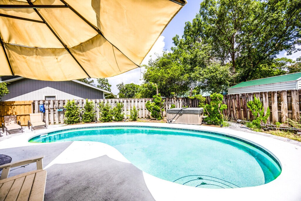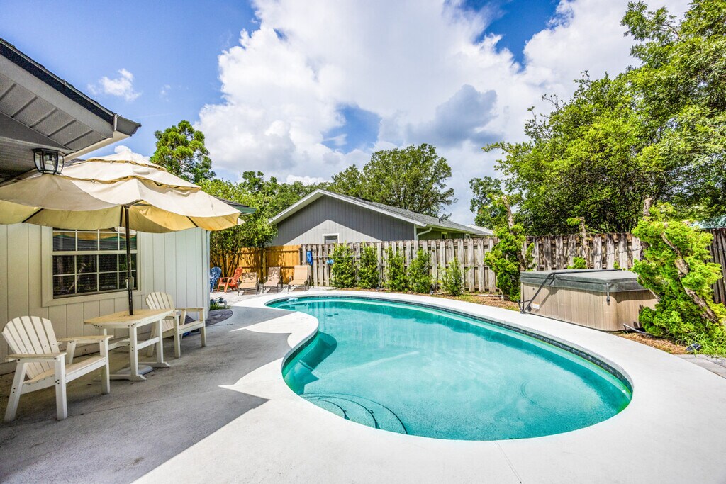 Welcome to your Gainesville getaway, a beautifully updated 3-bedroom, 2-bathroom home where you can feel at home and enjoy North Florida like a local. Located in a quiet, centrally located neighborhood, this spacious home features an open floor plan and a fully equipped kitchen. Enjoy the sparkling pool (pool is not heated), hot tub, bright Florida room with a large TV, and a second seating area on a pavered deck. Other amenities include high-speed Wi-Fi, smart TVs (indoor and out), a washer/dryer, and central AC. Free driveway parking and self check-in are available. Just minutes from the University of Florida & Shands, downtown Gainesville, shopping & dining on Newberry Rd, and local parks and springs, this home is the perfect base for comfort and convenience. Smoking inside the home will result in a $250 fee. Quiet hours are from 9:30 pm to 8 am, and you may be asked to leave without a refund for violations. One pet is allowed if disclosed during booking, otherwise, there is a $200 fee if caught with an unreported pet. Please clean up dog waste, or a $100 fee will be charged if dog waste is left behind. [SI]