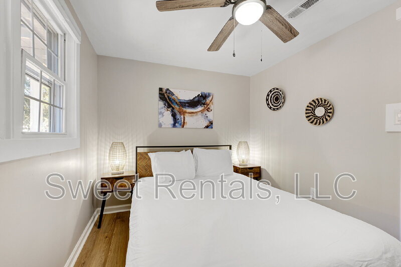 Spruce Bungalow is a fully furnished, 30-180 day rental conveniently located in North Charleston just outside of Park Circle. This lovely home has been fully renovated and offers a cozy, yet airy feel with modern fixtures and furnishings along with new luxury vinyl plank flooring. The fully fenced in back yard is perfect for entertaining or simply relaxing after a long day. It features a gas grill, a picnic area, and a fire pit surrounded by 6 Adirondack chairs. Step into the inviting entry of this charming home to find a beautifully appointed living space. Designed with a fresh, modern concept, the living room, dining room, and kitchen flow naturally together creating a pleasing aesthetic. The living room offers luxurious seating for four, a smart TV, and a large window that allows for natural light to spill into this open concept space. The mid-century modern feel continues into the dining area with a table for eight. Additional seating in the form of two bar stools is available at the kitchen island. The gorgeous Quartz countertops are a perfect compliment to the navy blue cabinets and brushed gold fixtures. The brand new stainless steel kitchen appliances include a dishwasher, gas stove/oven, refrigerator with a water filter and ice-maker, and a built-in microwave. The spacious primary suite is positioned away from the remaining bedrooms and features a king size bed, two bedside tables, a smart TV, and an ensuite bathroom that includes a double vanity, a tiled shower, a stackable washer/dryer combo, and a spacious walk-in closet. The three remaining bedrooms are located off of the rear hallway. Two of the rooms feature queen size beds and the third guest bedroom offers a bunk bed with two twins positioned as the lower bunk (sleeping 3). The guest bathroom, positioned off of the rear hallway, offers a tiled tub/shower combo and additional storage for linens. Spruce Bungalow is conveniently located close to Park Circle and North Charleston area attractions such as the Tanger Outlets, Top Golf, Whirlin' Waters, the North Charleston Coliseum, Riverfront Park, Firefly Distillery, Holy City Brewing, Commonhouse Ale Works, many renowned area restaurants, and so much more. Whether you are new to the area and renting before you buy or relocating for work, this home could be the perfect fit for you. *Dogs are welcome. *2 Pet Max* Property amenities: Central Heating & Air Conditioning Gourmet Kitchen Dishwasher Washer Dryer Flooring: Luxury Vinyl Plank Fully Furnished Fenced in Back Yard Fire Pit Picnic Area Propane Grill Pet Details: 2 Dogs Max