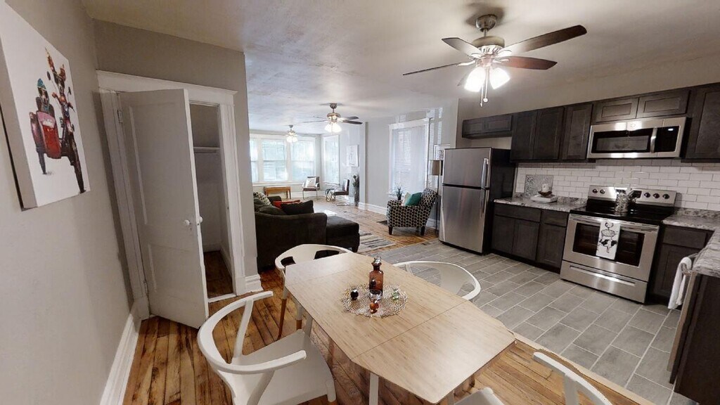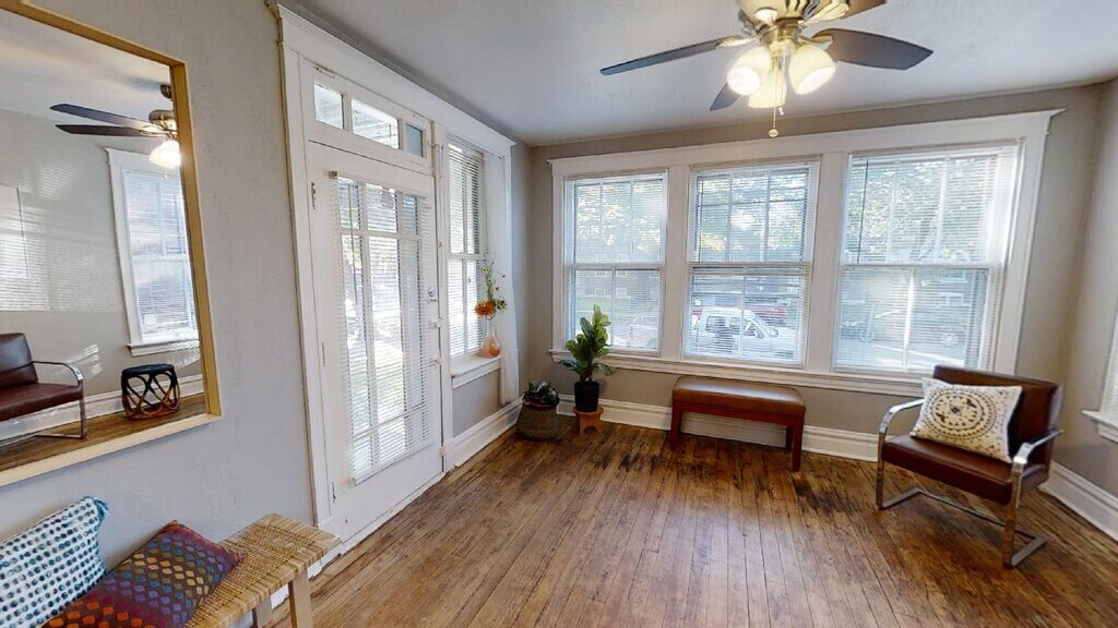 Full open concept kitchen incl dishwasher, microwave, range and refrigerator, plus a sizable pantry and enough room for an island or kitchen table, you'll gather here with friends, and spill over to your back porch to enjoy summer evenings under a gorgeous gingko tree (just in time for glorious golden leaves in fall!) A full updated bathroom with new tile and a large walkin closet! The front room has windows on three sides making it a great hangout place, Walkin closet and additional in bedroom. The kitchen is open to a large area and it can be a dining / living room its open style living. Applications can be submitted at $50 Application fee will apply, tenants must have 3X the rent in income, and no evictions. Application process requires a copy of valid state ID, 2 most recent paystubs, 2 most recent bank statements and all tenants 18 or over must apply and be on lease. Pls expect email with avail tour times + text (417 area code) to schedule. We...
