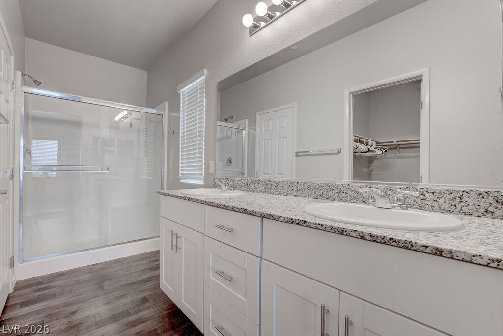Cozy, clean, and beautifully maintained, this 2-bedroom, 2-bath home offers modern style and comfortable living in a desirable gated community. Contemporary gray tones throughout create a sleek, cohesive look, while abundant natural light enhances the inviting atmosphere. The kitchen is thoughtfully designed with granite countertops, crisp white cabinetry, stainless steel appliances, a built-in microwave, and a pantry for added storage—perfect for both everyday meals and entertaining. Both bathrooms feature matching granite countertops for a polished finish. The spacious primary suite includes dual sinks and a generous walk-in closet, providing both convenience and functionality. With its stylish upgrades, smart layout, and secure community setting, this home is an exceptional opportunity for easy, low-maintenance living.