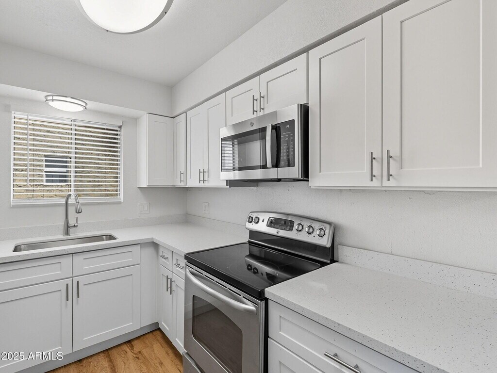Come see this 2 bedroom,1 bathroom condo with a 1-car carport,located in a gated community. It has a freshly painted interior and brand-new,neutral wood-look laminate flooring that flows seamlessly through the unit. The updated kitchen is a true highlight,featuring custom shaker cabinetry,quartz countertops,& stainless steel appliances. The bathroom has been thoughtfully renovated with a brand-new vanity,toilet,and has a tub/shower combo.