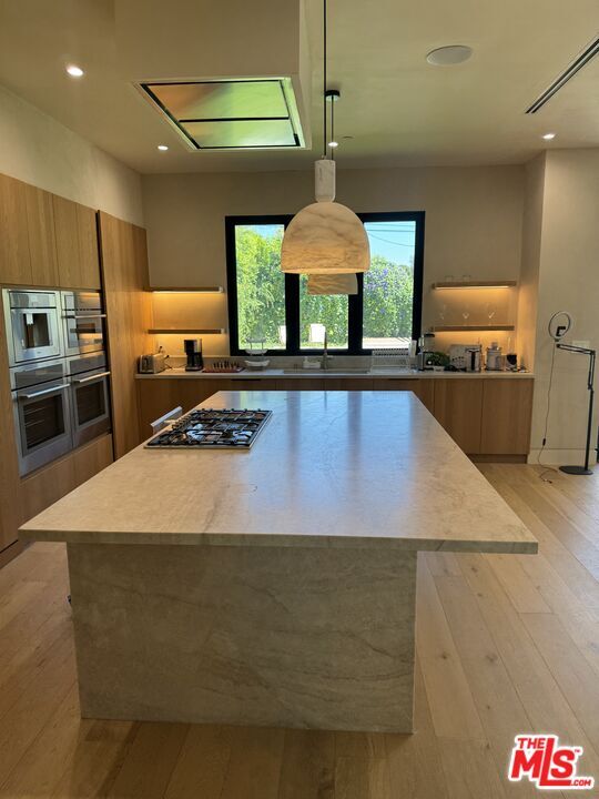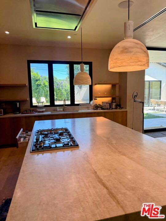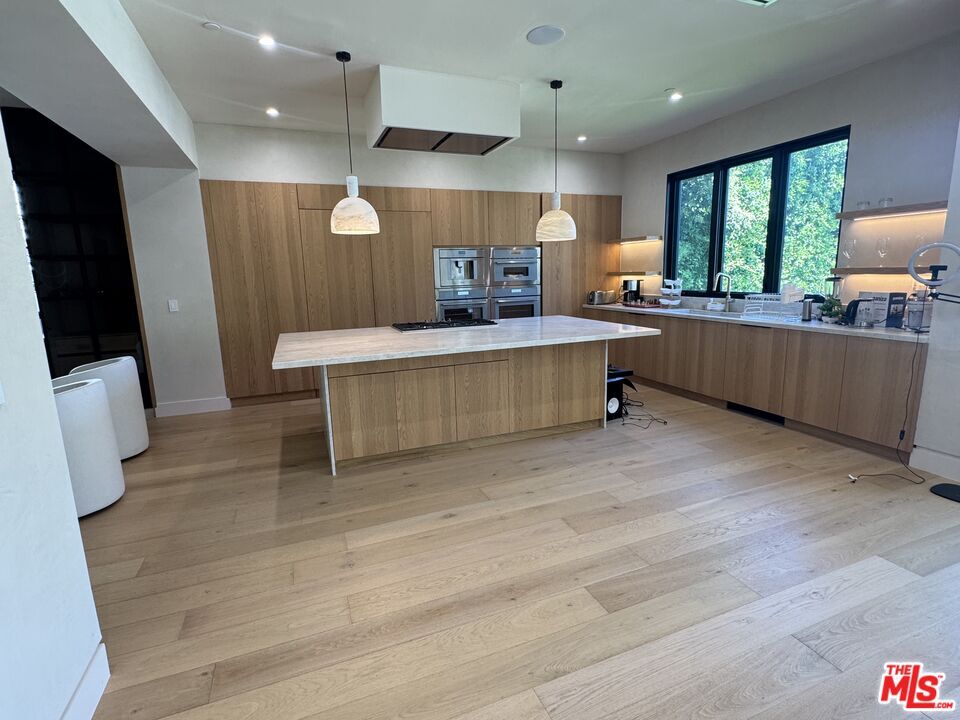 Welcome and be the first to live in this exceptional new construction estate situated in the heart of Sherman Oaks. This gated property offers a 5-bed, 6-bath in the main residence, along with a versatile detached ADU. A charming white brick facade, complemented by organic design elements, sets the tone for a warm and inviting home that effortlessly blends timeless elegance with modern amenities. Inside, enjoy an open-concept layout that features a gourmet chef s kitchen outfitted with top-of-the-line appliances, Taj Mahal quartzite countertops and a large island with a breakfast counter. The adjacent formal dining room is illuminated by a bespoke chandelier, perfect for hosting intimate dinner parties or large gatherings. Highlighted by a hand carved, fluted limestone fireplace, the spacious living room also boasts an oversized sliding glass door that disappears into the wall, seamlessly extending your living space outside. Privacy hedges envelop the property, creating a personal sanctuary that offers a sense of reprieve from the hustle and bustle of the outside world. Designed for both relaxation and entertaining, the backyard features a sparkling pool/spa, outdoor kitchen, lush grassy yard, and ample patio space for al fresco dining. Head upstairs to find a well-appointed laundry room and four generously sized ensuite bedrooms, including a luxurious primary suite that consists of a private balcony with a cozy fireplace, custom walk-in closet, and chic spa-like bathroom, complete with a rainfall shower, soaking tub, and double vanity. The detached ADU is equipped with a kitchenette and full bath, providing endless possibilities - utilize the space as an office, gym or separate living space for family/guests. Additional highlights include a main-level ensuite bedroom, high ceilings, stunning white oak flooring, built-in speakers, and a two-car garage. Located just moments from Westfield Fashion Square, Ventura Boulevard s vibrant shopping and dining scene, and top private schools such as Notre Dame, Harvard-Westlake, and Campbell Hall. MLS# 25589967