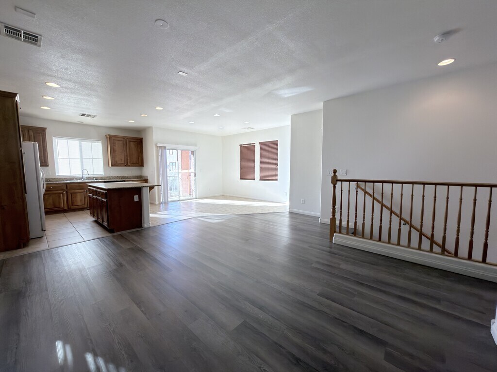This amazing three-story home has four bedrooms, three bathrooms, and a two-car garage. The spacious living room and kitchen are on the second floor. The kitchen has a Granite countertop and island. The dining area is adjacent to the balcony. The house has new paint. Except for the carpet in the bedroom, the rest are all tiles and laminate. There is a bonus bedroom and a 3/4 bath Downstairs. Master bedroom, another two bedroom, laundry room on the third floor. It is close to Highway 215, a shopping area, and a school. No washer provided.