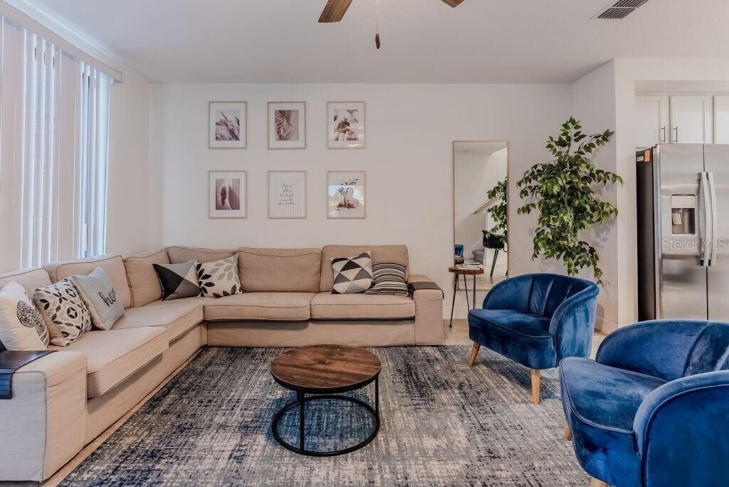 Ideally just 10 minutes from Celebration and Orlando's world-renowned theme parks,this beautifully furnished four-bedroom,3.5-bath townhome offers a combination of comfort,privacy and convenience. In a desirable gated community adjacent to Mater Palms Academy,the home provides easy access to top-rated schools,shopping,dining and entertainment. The open-concept layout showcases spacious living areas filled with natural light,modern finishes and stylish décor throughout. Go outside to a private patio overlooking a peaceful pond,an ideal spot to relax and unwind. Residents enjoy resort-style community amenities including a pool,clubhouse and soccer field,all contributing to the ultimate Florida lifestyle. Easy approval. MLS# O6353577