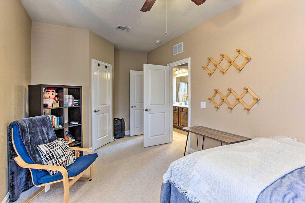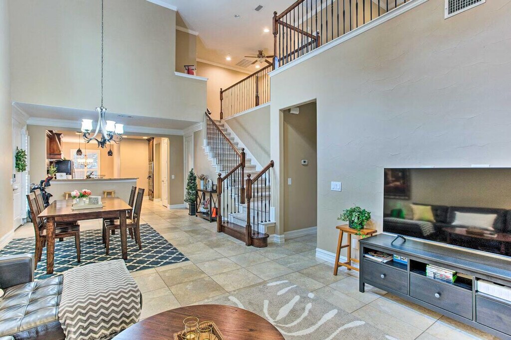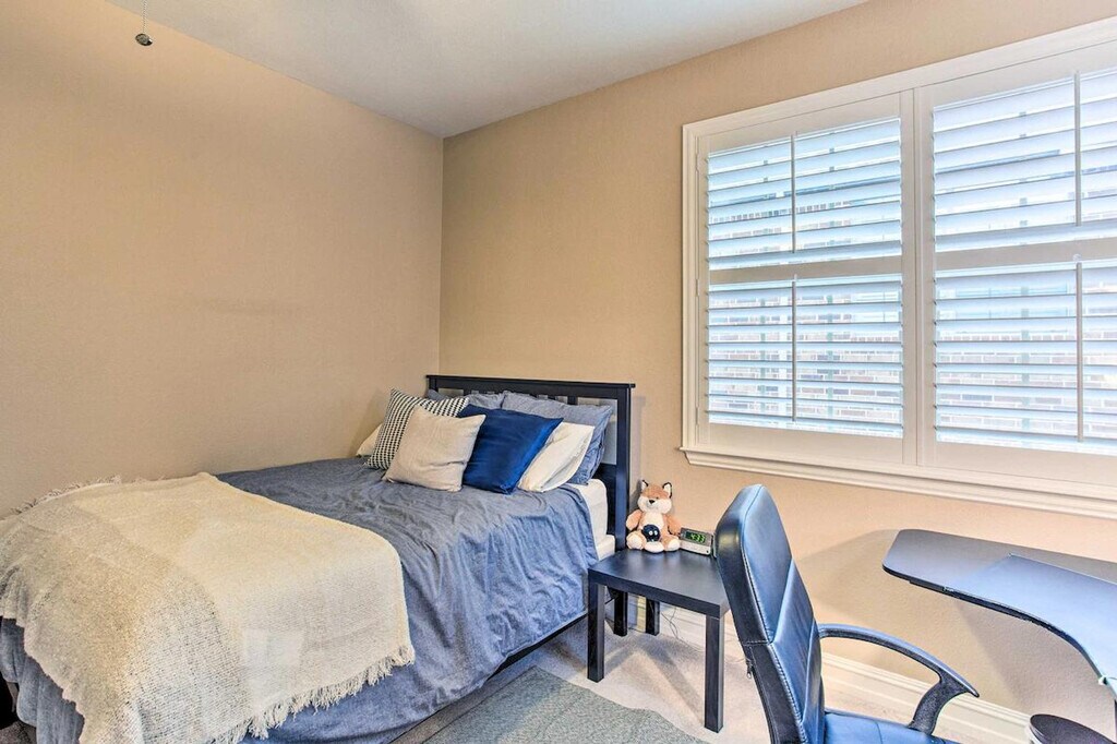 Feel at home in this Texas retreat, a 2-bedroom, 1.5-bathroom townhome in Plano. This townhome boasts a fully equipped kitchen and smart TVs. The kitchen features a refrigerator, stove/oven, dishwasher, microwave, coffee maker, dishware and flatware, toaster, blender, cooking basics, and breakfast bar seating. Additional amenities include a dining table, board games, workspaces, books, ceiling fans, a washer and dryer, towels, linens, complimentary toiletries, central air conditioning, hangers, a hair dryer, and keyless entry. Enjoy the charcoal grill, patio, fenced yard, and seating. Enjoy access to the community pool, open June through August. Ideally located, this home allows you to easily enjoy the Ford Center, explore downtown Dallas, or test your luck at The Clubs of Prestonwood golf course. Stairs are required to access the property. There are 4 exterior security cameras: 1 camera is located at the front door facing the entryway, 1 camera is located at the backdoor facing the backyard, 1 camera is located on the garage door facing the garage entrance, and 1 camera is on the garage facing the driveway. The cameras are outward facing and do not look into interior spaces. The cameras record video and sound when activated by motion. They will record when they first sense motion and 30 seconds after the last motion is detected. No smoking, pets, events, parties, or large gatherings are allowed. [SI]