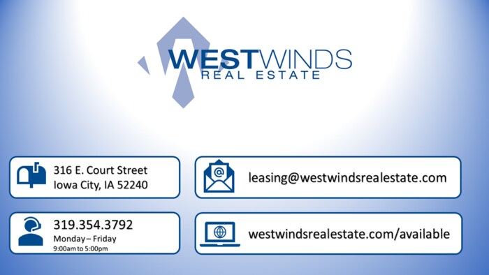 This 2 Bedroom, 1 Bathroom CONDO is available for 08/01/2026 Move In! Occupancy [Limited to 3 non-related adults] [VIDEO TOUR - SIMILAR UNIT - 411] Copy this link to your browser to schedule a showing at your convenience. 2 Bedroom, 1 Bathroom condo located in Iowa City. This 3rd [TOP] floor condo is located in a secure building, has forced/central air for heating & cooling, and comes with a garage and reserved parking spot! The living room is spacious and the full kitchen features dishwasher and plenty of cabinetry space. Washer and Dryer [Included] located in kitchen. Both bedrooms have full closets and the bathroom features a full tub. The Court Hill Condos are conveniently located on the corner of Scott Boulevard and East Court Street with nearby convenience stores, grocery, shopping, parks, bus stops and more! Quick access to i80 as well! Services INCLUDED in Rent • GARBAGE • LAWN CARE • SNOW REMOVAL Utilities NOT INCLUDED - Tenant Responsibilities - ELECTRICITY & GAS: MidAmerican - 12 - Month Average as of APRIL 2021 - $90/month** **Usage varies by individual tenant use - WATER: City of Iowa City Additional Disclaimers *Photos MAY be of a similar unit *PET ALLOWED for additional monthly fee (Pet Limitation of 1 up to 30lbs) *Floor plans MAY be of a similar unit *1 Car Garage [DETACHED] Included in Rent + 1 Assigned Parking Spot Please visit our website for additional rental properties, for application details, schedule showings, and much more! Contact us to schedule a showing.