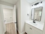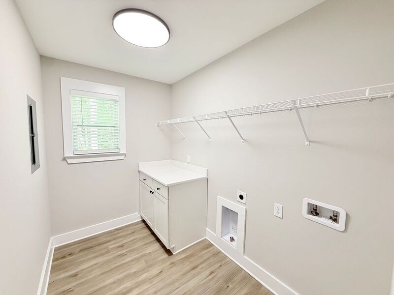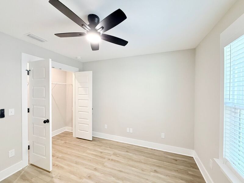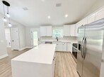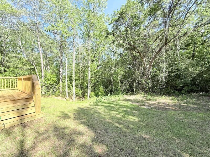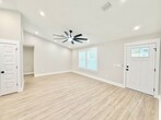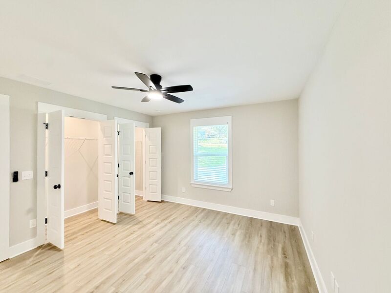View In 3D: This inviting home features an open-concept living area with an extra-large ceiling fan and luxury vinyl plank flooring throughout, creating an elegant, cohesive space. A circular driveway and covered front porch add both convenience and curb appeal. The kitchen is well-equipped with a spacious pantry, white stone countertops, white cabinetry, a center island with storage, a dual-basin undermount sink, and stainless steel appliances including a French door refrigerator, flat-top range, built-in microwave, and a dishwasher. The primary bedroom offers his-and-hers closets and an ensuite bathroom with a stylish barn door entry, single vanity, and a tub/shower combo. Two additional bedrooms each come equipped with ceiling fans and ample closet space, while the second full bath offers a single vanity and tub/shower combo. Additional highlights include a spacious laundry room with shelving and a folding area, a raised back deck, and a large, open backyard.